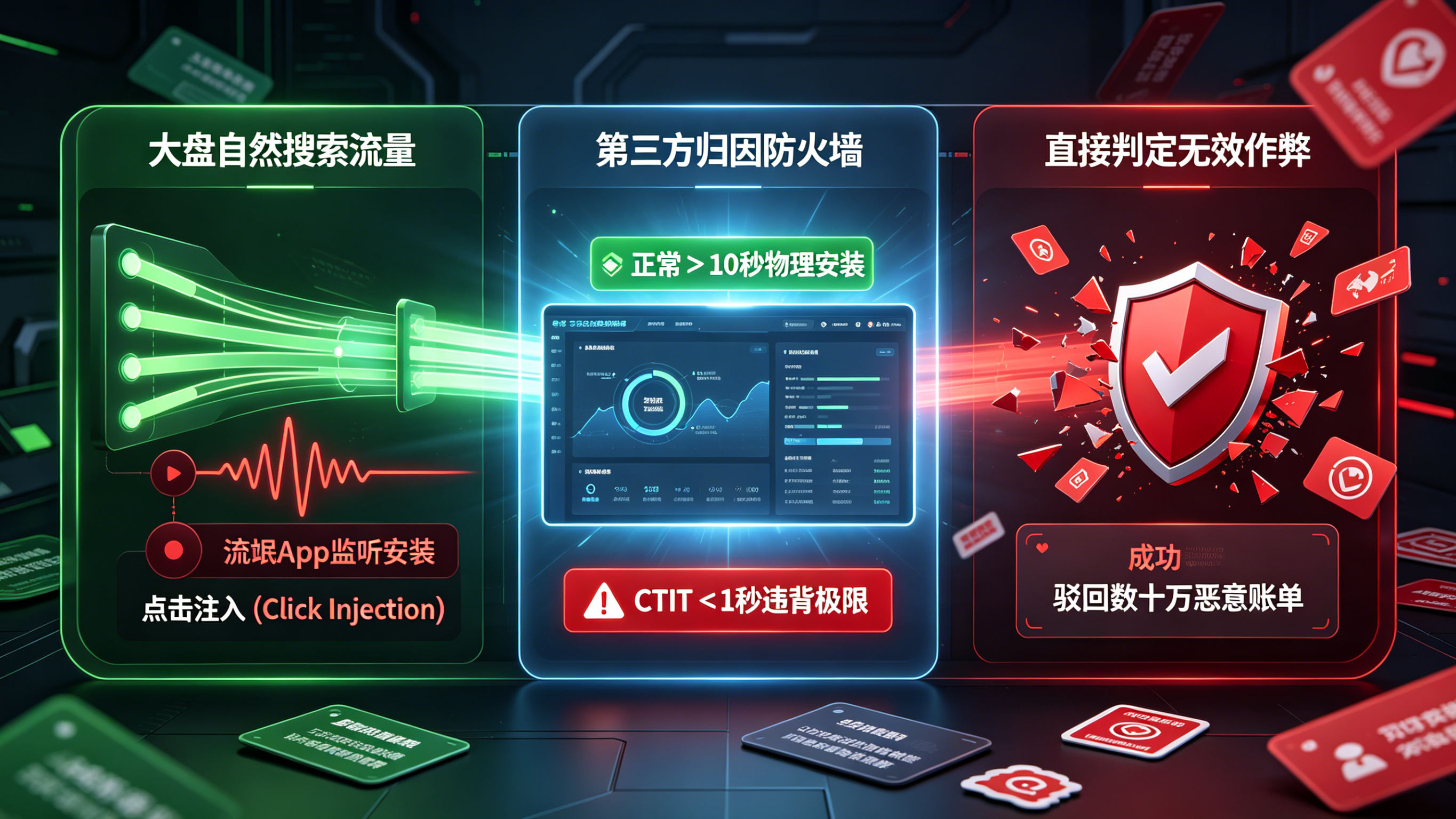 然而,审计日志显示出极其惊悚的极值:该联盟高达 85% 用户的 CTIT 小于 1 秒,甚至呈现出负数趋势。这是业界臭名昭著的“点击注入(Click Injection)”作弊——黑产通过流氓应用(如手电筒、清理大师等)监听安卓系统的安装广播(Install Broadcasts),在察觉到真实自然用户正在安装该电商 App 的最后零点几秒瞬间,伪造一次虚假的“广告点击”发送给归因服务器。由于归因平台通常采用“最后一次点击有效(Last-Click)”原则,这次注入的点击就成功抢夺了原本属于广告主自己的自然流量归属权。
