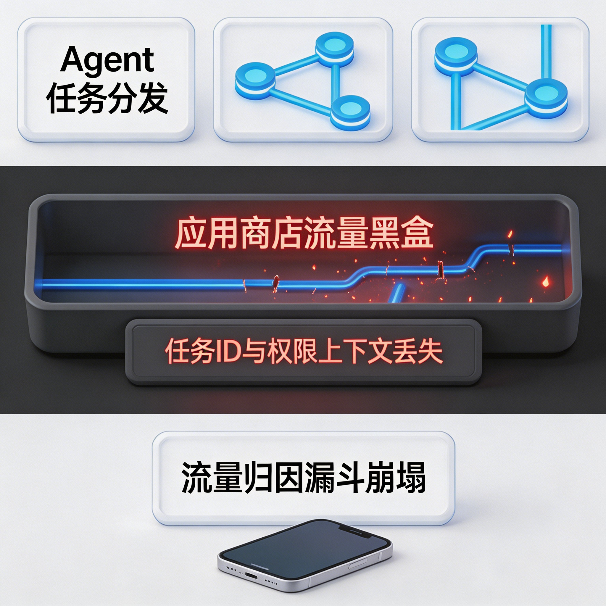 典型场景:企业Agent生成任务链接(如代码执行、数据查询),分享到Slack/微信群。用户点击,意图是下载App执行任务。但应用商店黑盒切断参数:任务ID、Agent来源、权限上下文丢失。新用户冷启动后,无法自动绑定任务,老用户无法获完成奖励。结果:流量虚化,归因失效,增长漏斗崩塌。