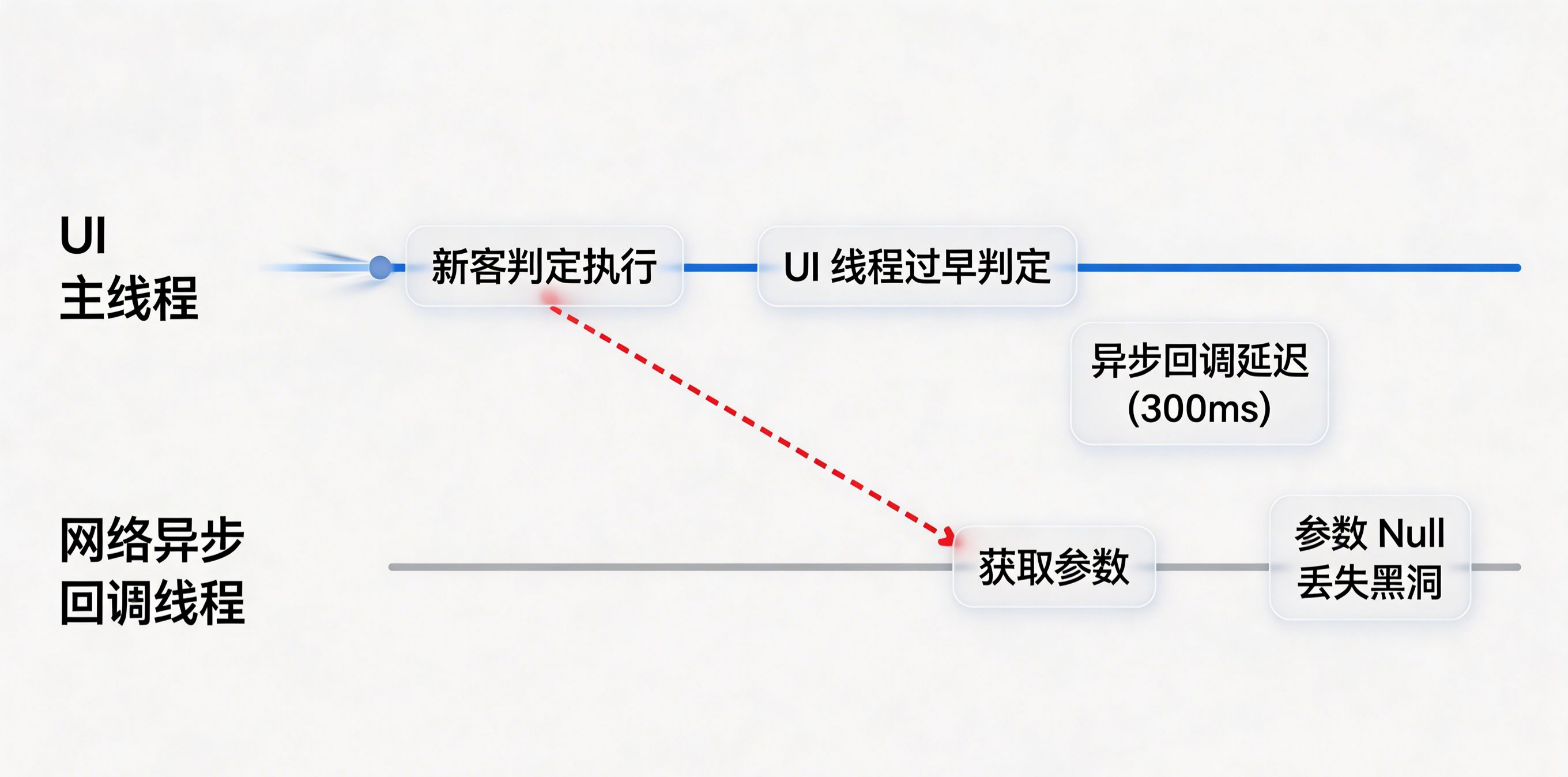 原有的开发人员为了图省事,直接将网络参数回传的 API 放在了应用首页 MainActivity 的 onResume() 生命周期内。由于冷启动时,App 不仅需要解析系统剪贴板,还需要向云端发送设备指纹特征进行网络鉴权,这部分异步网络请求通常需要耗时约 300 毫秒。但在很多中低端安卓机型上,UI 主线程的渲染速度极快,在异步回调结果还未返回之前,主线程里的新客判定逻辑就已经提前执行完毕。此时由于参数变量还没被异步线程赋值,业务层便直接上报了 Null,造成了典型的生命周期竞态条件错位。