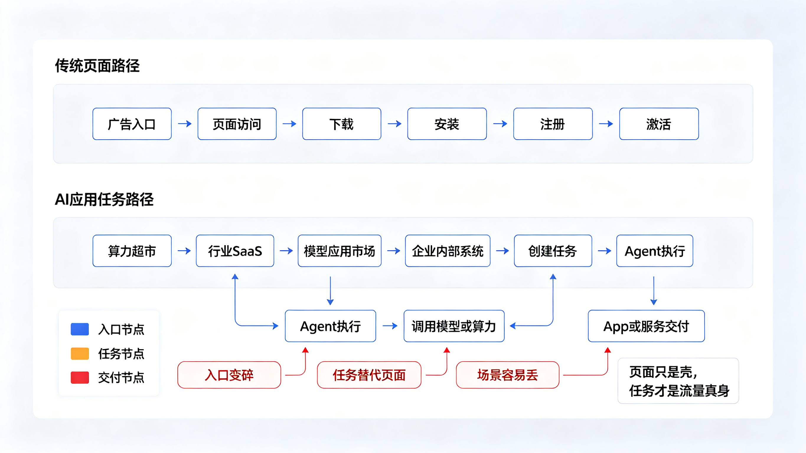 过去很多增长分析围绕页面访问、按钮点击、安装激活展开;但 AI 应用的真实使用越来越像任务链路:谁发起任务、任务在哪个平台创建、在哪个 Agent 中执行、最后由哪个 App 或服务完成交付。页面只是壳,任务才是“流量真身”。