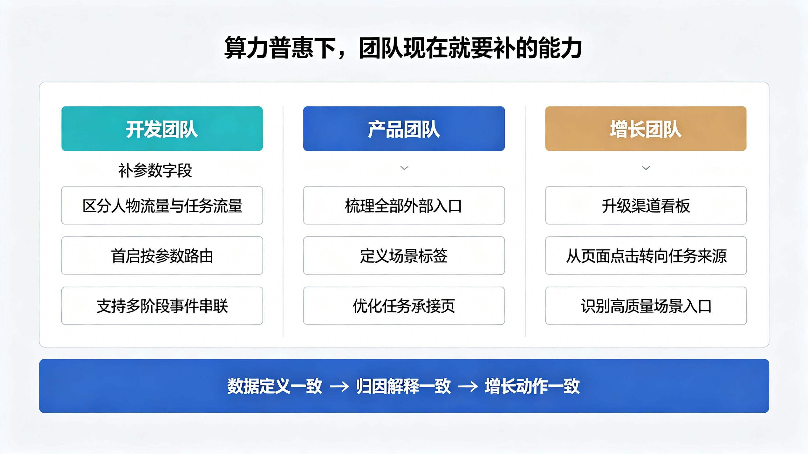 对 App 团队和 B 端产品团队来说,现在是一个很关键的窗口期:一边是政策在推动算力普惠,一边是任务流量正在替代传统页面流量。谁能先把渠道识别、智能传参和任务事件图搭起来,谁就更有机会接住这一波由算力下沉带来的真实应用增长。