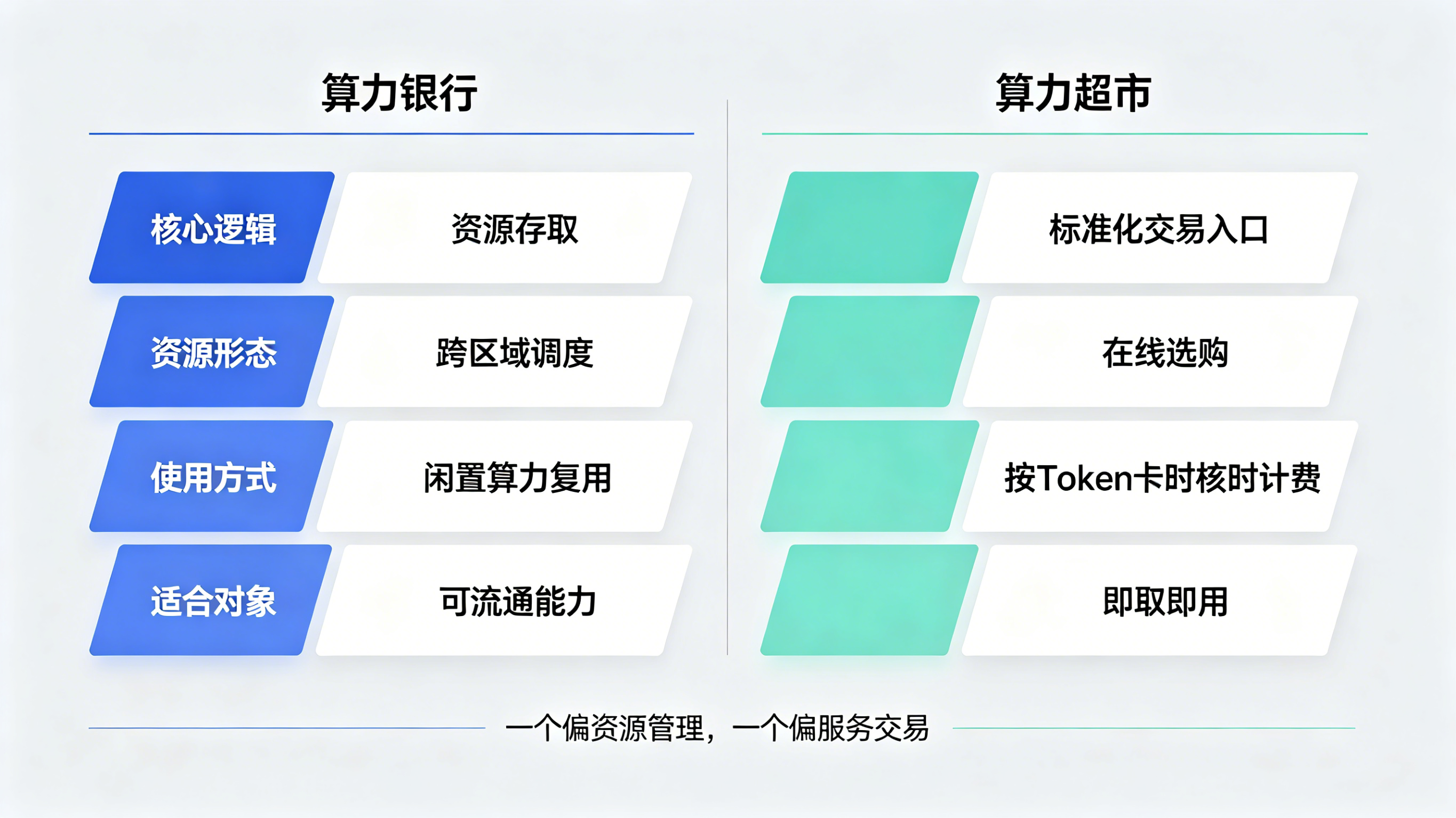 “算力银行”更强调资源的存取、调度和复用,核心是把闲置算力变成可流通能力;“算力超市”更强调标准化交易和在线选购,核心是让企业能像买云服务一样按需购买算力。一个偏资源管理,一个偏服务交易,但两者都在降低企业获取算力的门槛。