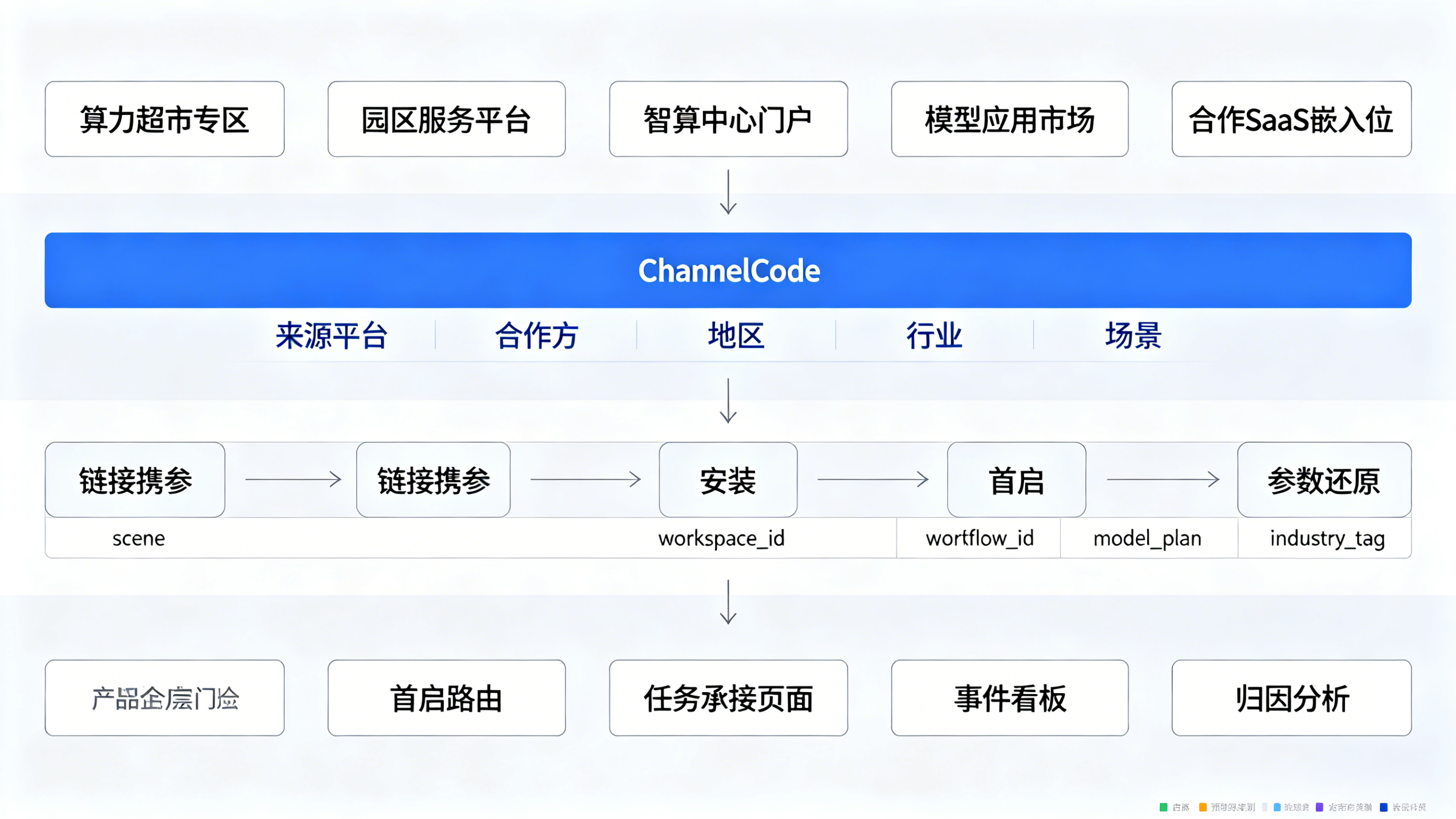 更稳妥的做法,是给每一个可控入口配置统一的 全渠道统计 标识体系,用 ChannelCode 把“来源平台、合作方、地区、行业、场景”编码进同一套入口标识中。比如可以区分“上海算力超市-金融专区”“河南智算中心-高校试用”“某SaaS工作流-制造业工具链”等不同来源。