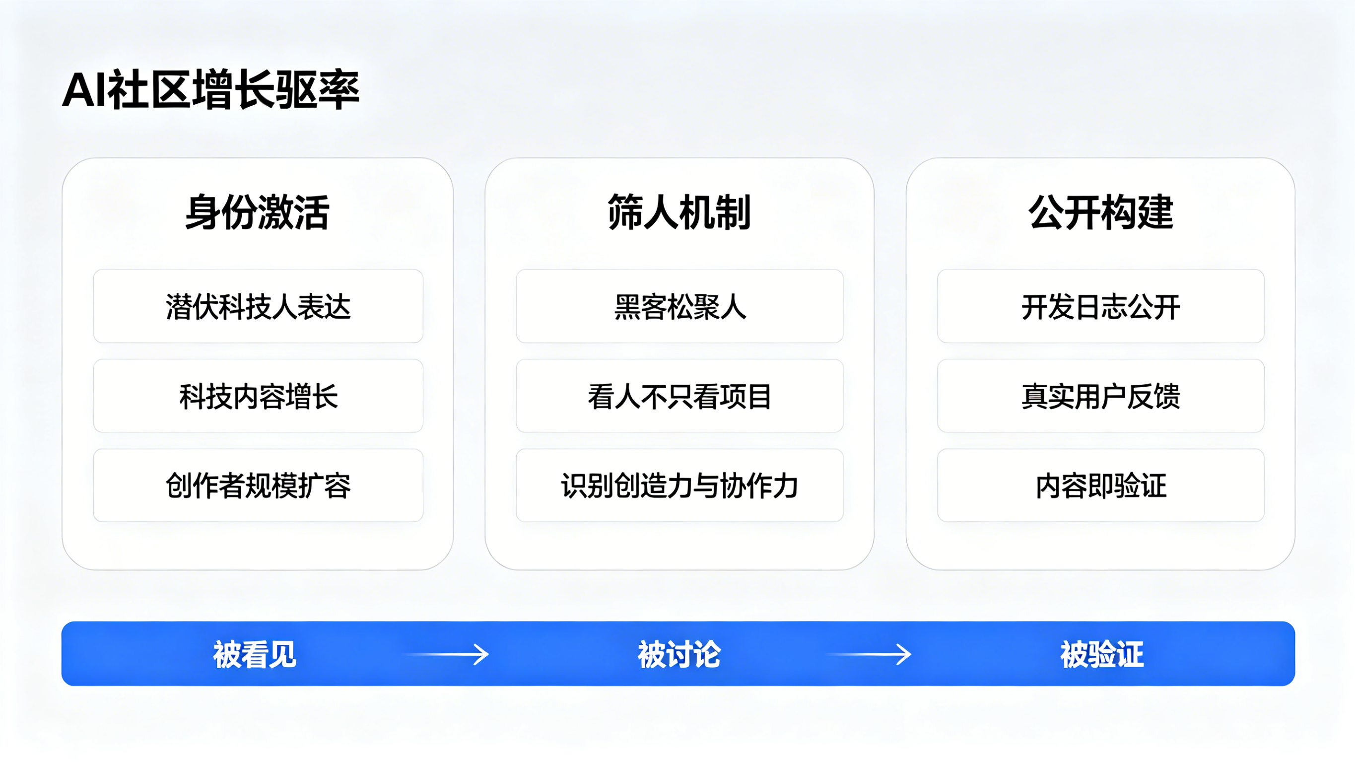 它不想像传统孵化器那样提供完整的创业支持体系,也没有把自己定义成“中国版 YC”。它更想做的是“连接器”——让不同角色在足够真实和足够开放的社区中相遇,让关注度、种子用户、合伙人、投资线索和 PMF 验证可以更早发生。
