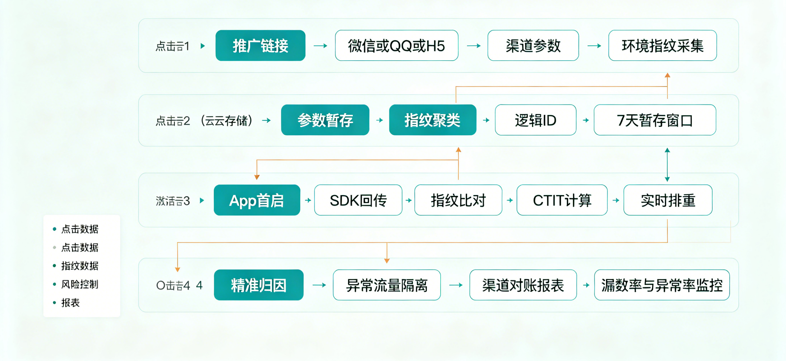 点击瞬间抓取23维非隐私特征(系统版本、屏幕密度、时区、IP段等),生成唯一逻辑ID。激活时SDK回传相同指纹,云端毫秒级聚类匹配,准确率98%。无需IDFA/OAID,完美适配隐私环境。