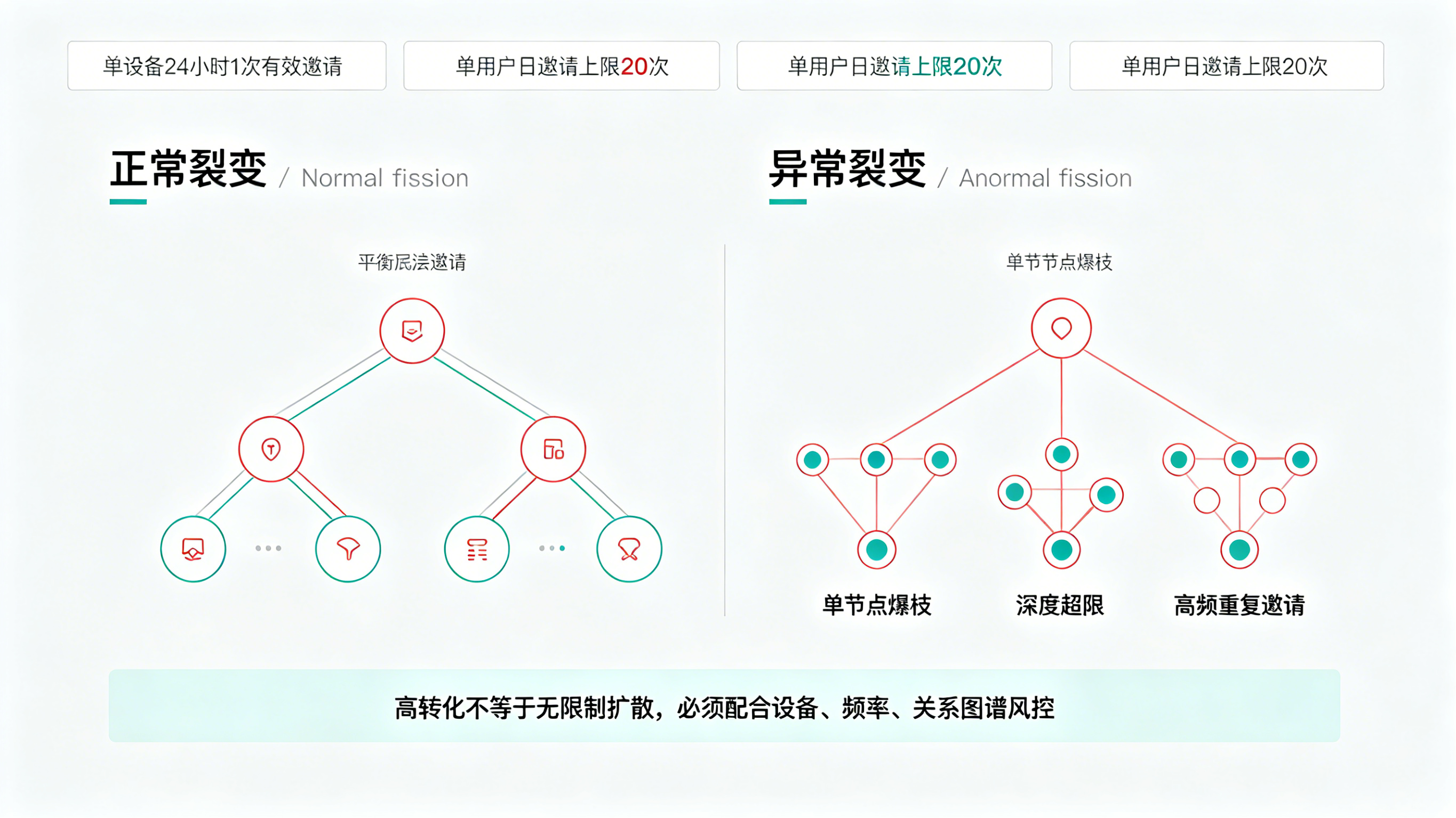 实时构建全网邀请关系图谱,监控裂变树深度。正常裂变树呈自然分布,异常刷量表现为"单节点爆枝"或"深度超5层",自动隔离审核。