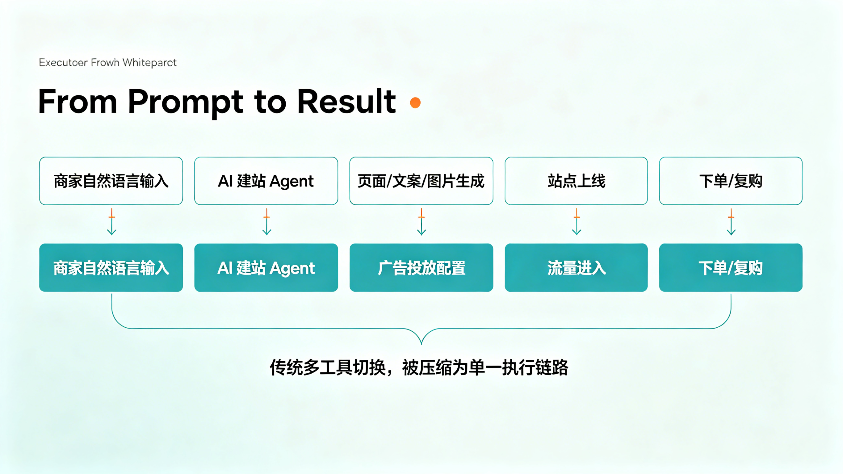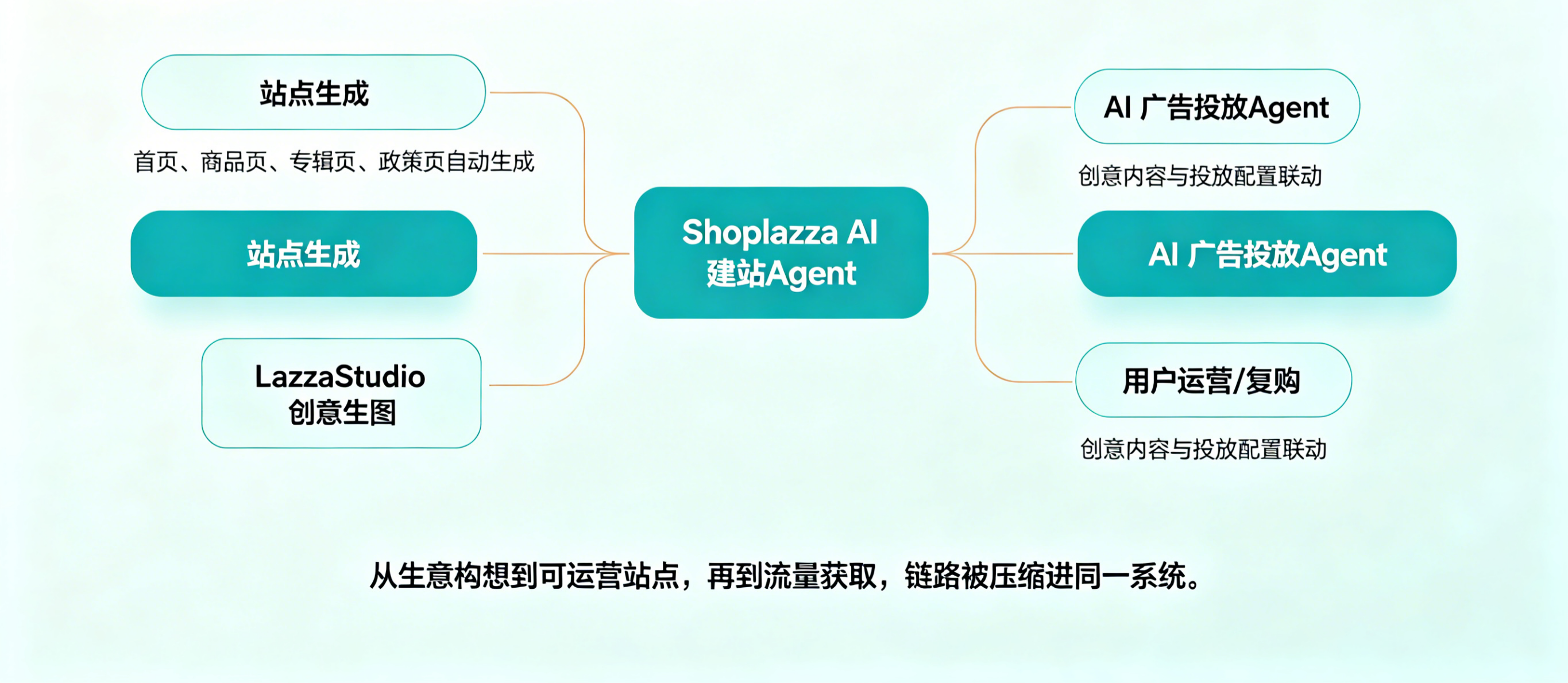 因为一旦建站、素材、广告、支付、物流和后续用户运营都能通过统一 AI 编排机制协同起来,那么商家面对的就不再是一个个工具模块,而是一个“从意图到结果”的执行系统。