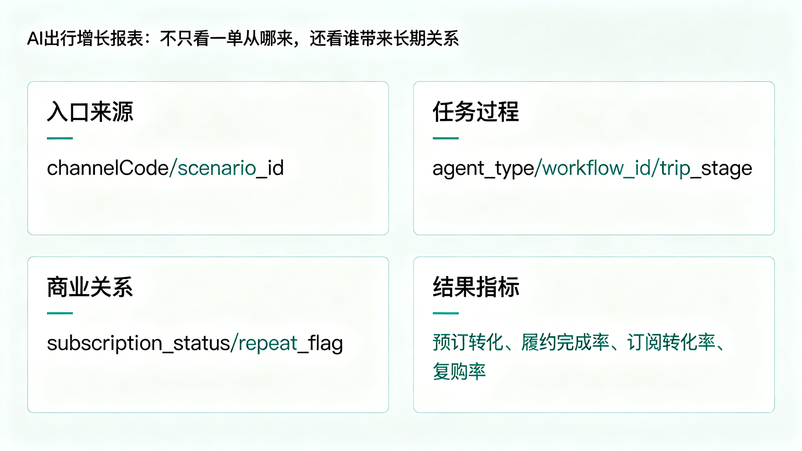 带来的好处是,当用户真正进入下单、改签、支付、履约或后续复购环节时,系统不只知道“订单来了”,还知道“这单是因为什么场景来的、约束条件是什么、属于哪种出行任务”。