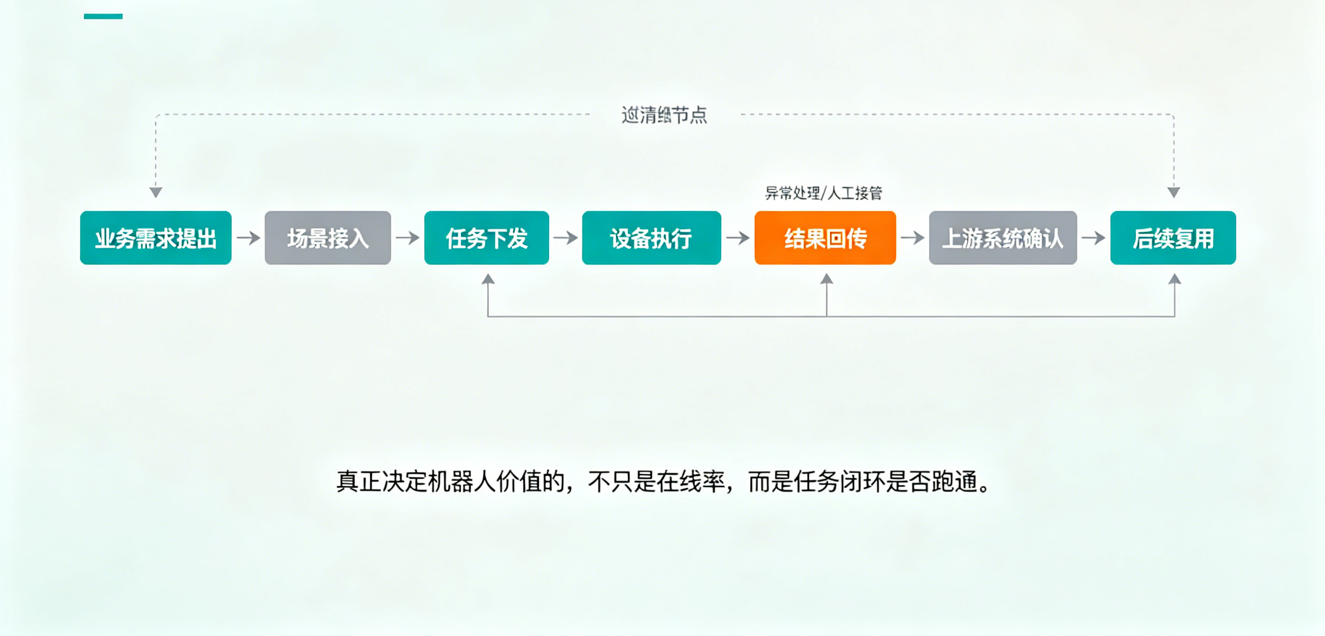 因为这些指标只告诉你设备在不在工作,不能告诉你任务跑得好不好。企业更关心的是任务有没有完成、失败发生在哪、人工兜底多不多、哪些场景更值得扩张。设备指标是基础,任务指标才是经营指标。