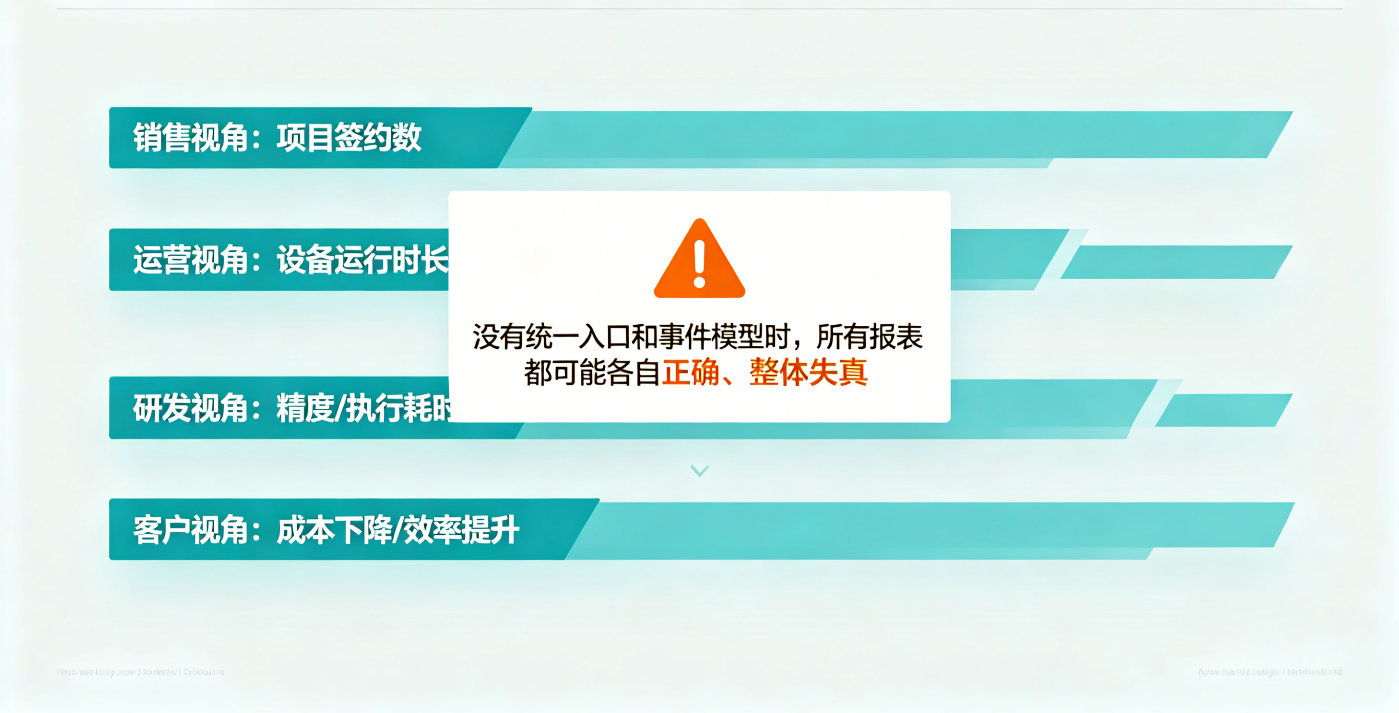 销售侧看到的是“项目签了多少”;运营侧看到的是“设备运行了多久”;研发侧看到的是“识别精度和执行耗时”;客户看到的是“人力成本有没有下降”。这些指标各自都没错,但一旦没有统一入口和事件模型,它们之间就很难互相印证。最终管理层看到的是几张彼此都能自圆其说、却无法真正回答业务问题的表。