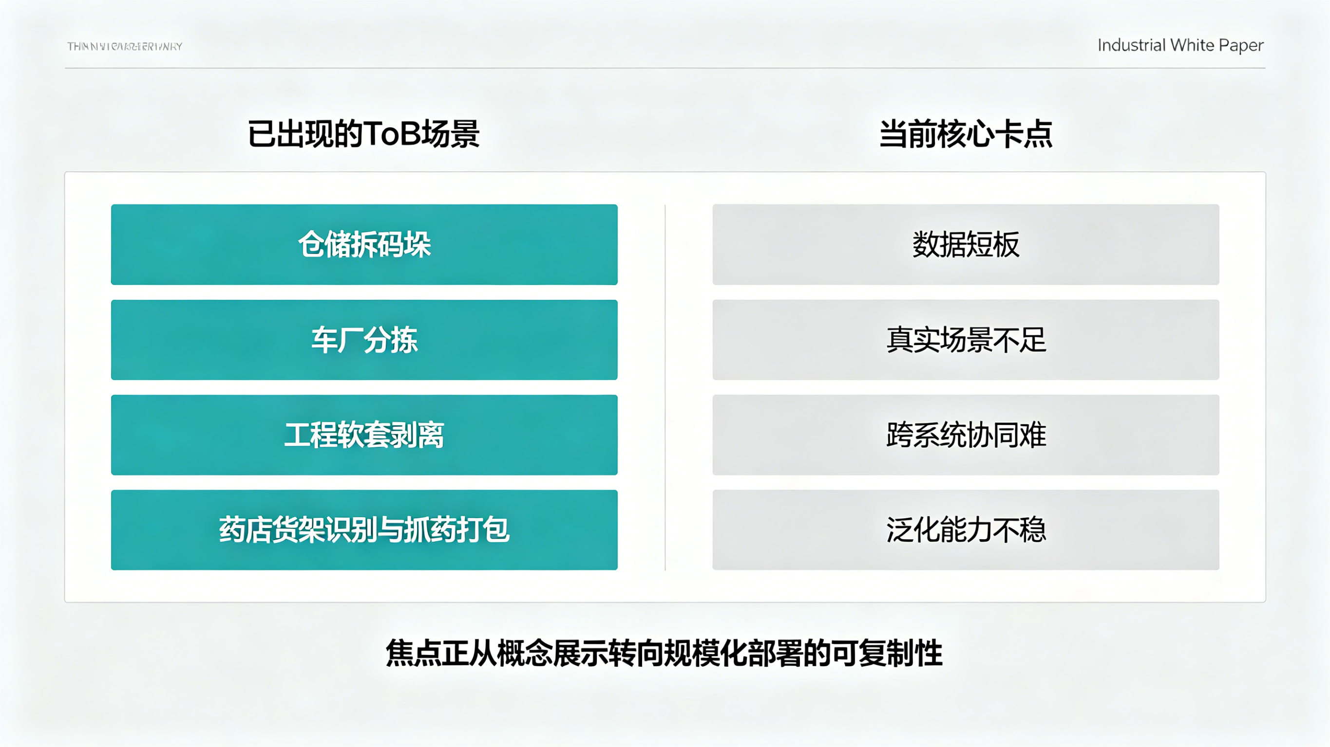 这个逻辑对 ToB 尤其明显。消费级 AI 产品还能通过海量用户交互不断迭代,但企业机器人面对的是离散、非标、成本高、容错低的物理世界。一个车厂的零部件摆放方式,一个药店的货架品类变化,一个仓储现场的临时障碍物,都会让机器人面临新的输入。数据一旦不足,泛化就会失真;泛化一旦失真,部署就无法规模化。