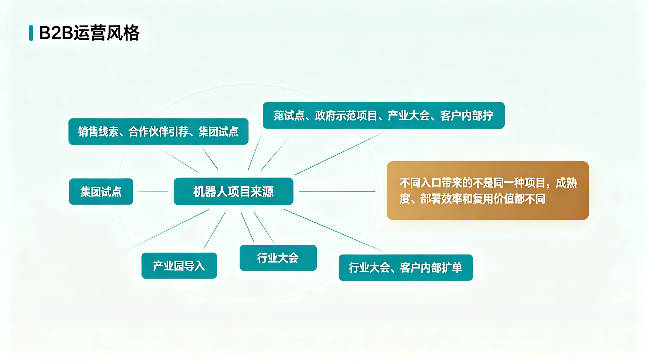 在 ToB 部署里,机器人项目可能来自销售线索、合作伙伴引荐、集团试点、政府示范项目、产业园导入、行业大会、客户内部扩单。表面看都是“客户需求”,实际上来源完全不同,后续转化质量也完全不同。