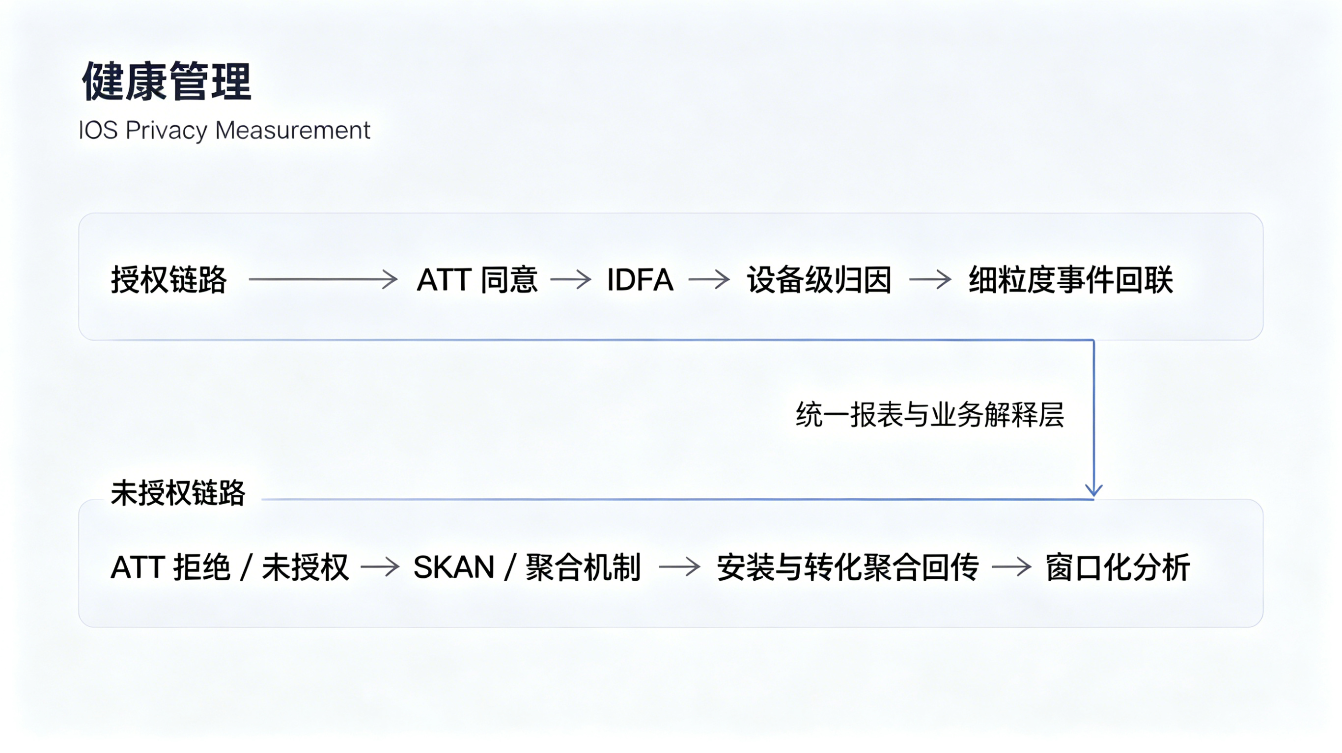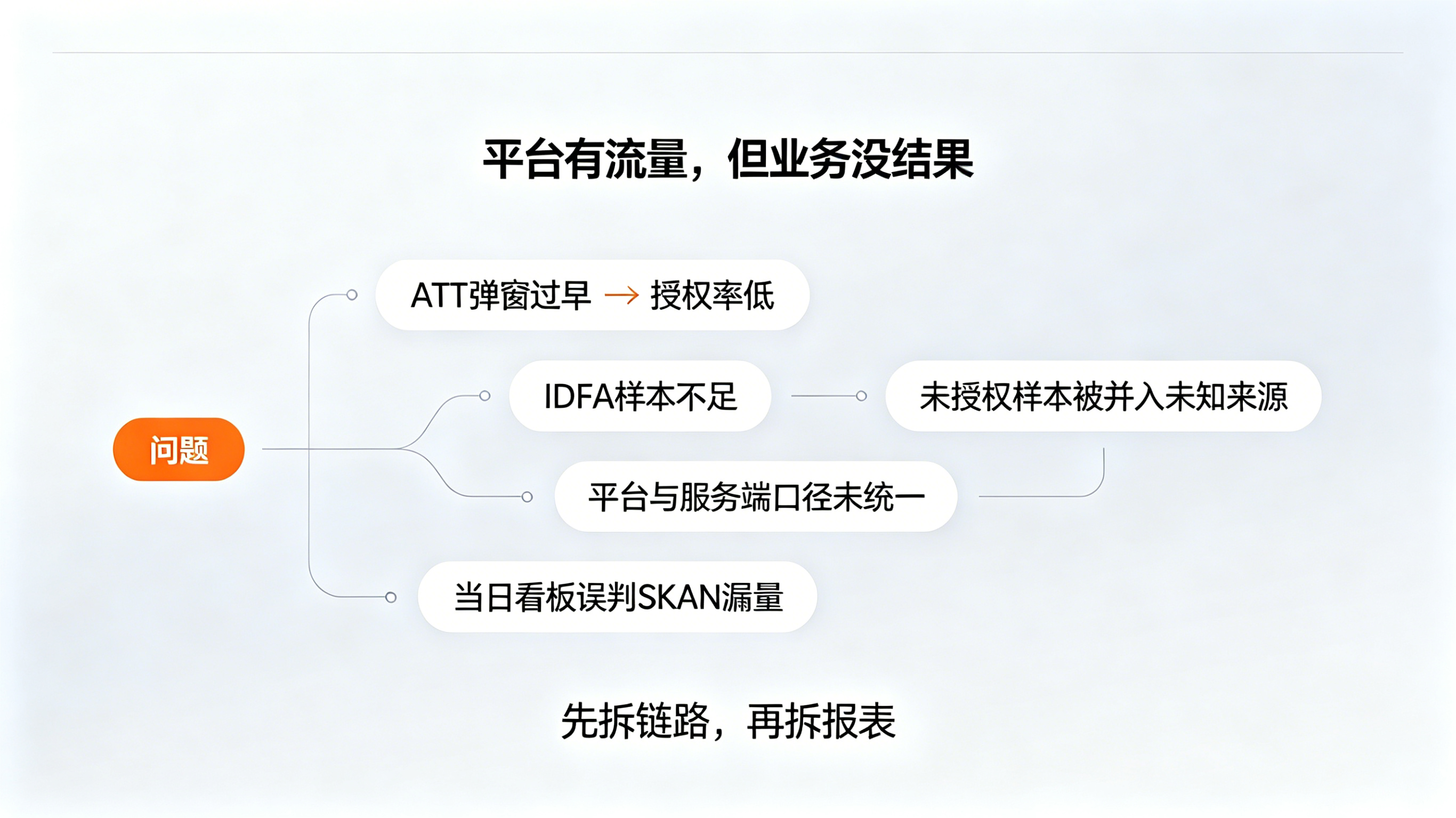 第二步,按授权与未授权两条链路拆分日志,发现授权链路主要由 IDFA 归因,未授权链路则由 SKAN 提供数据,二者在平台与服务端中没有被统一口径解释;