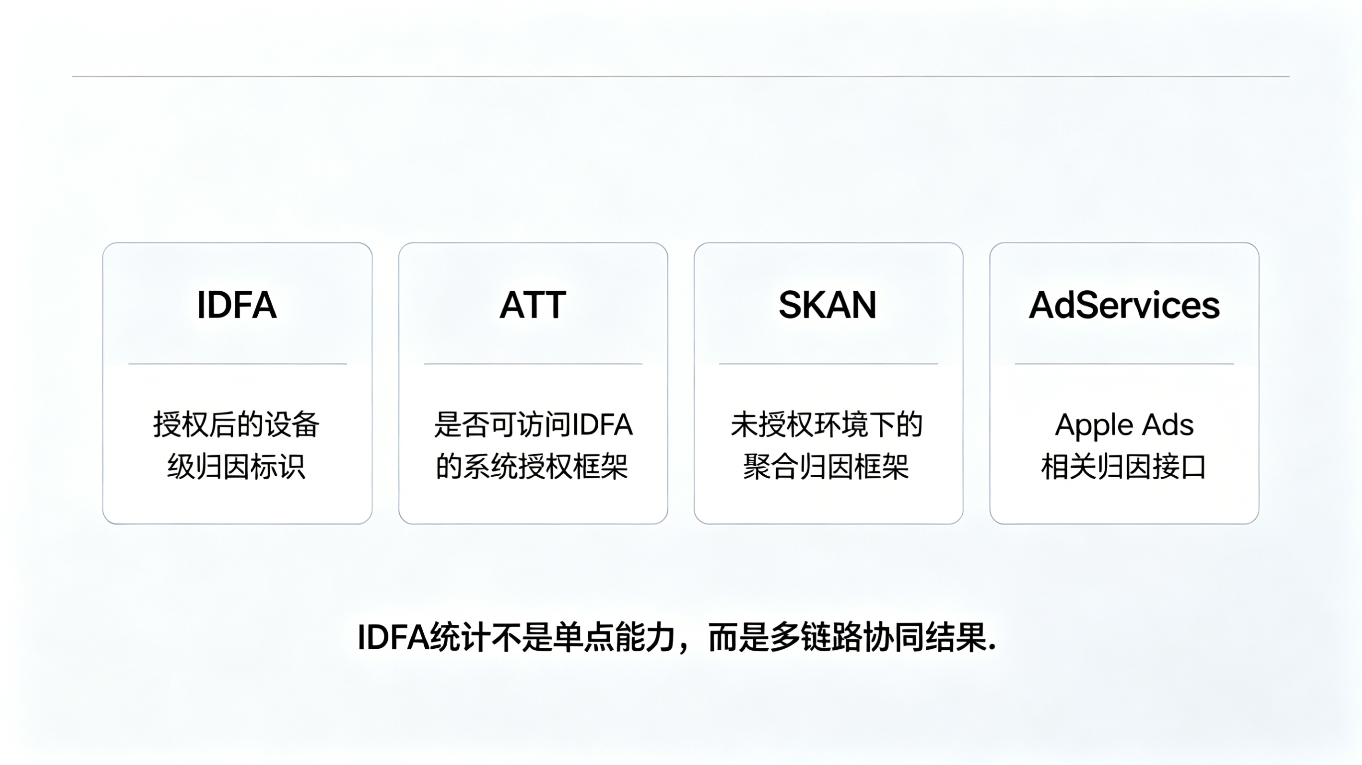 IDFA 统计并不是孤立存在,它与 ATT、SKAN、AdServices 共同构成“从授权到归因到回传”的完整链路。