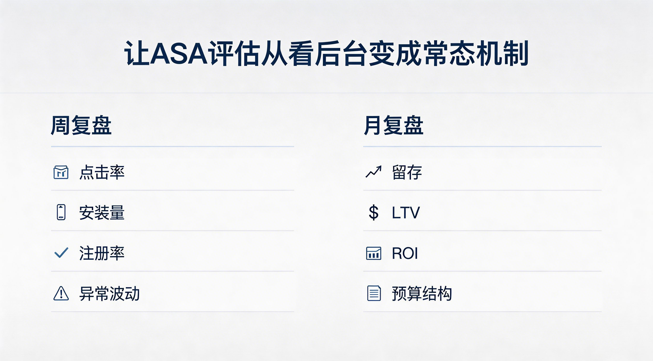 | ASA + 归因平台 + 业务结果模型 | 从关键词到 ROI 的完整链路 | 建设和协同要求更高,但判断最完整 | 精细化投放、预算决策、策略迭代 |