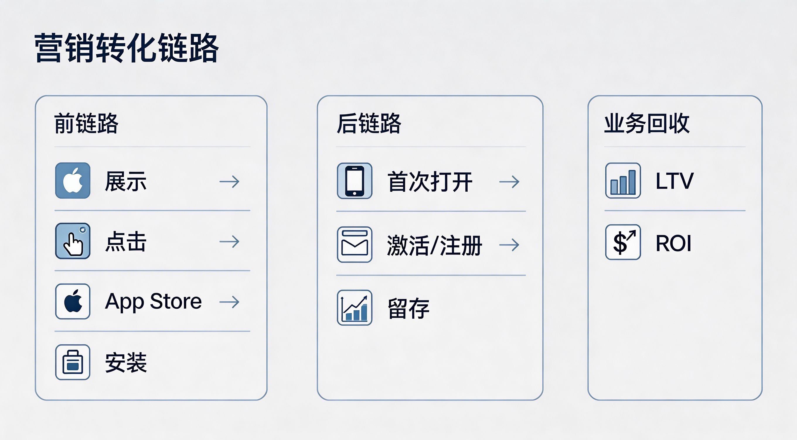 要把苹果广告评估做准确,首先要把完整链路画出来。对大多数 App 来说,这条链路通常是:展示 → 点击 → App Store 落地 → 安装 → 首次打开 → 激活 / 注册 → 留存 → LTV → ROI。前半段解决的是广告触达和转化发生没有,后半段解决的是用户价值到底高不高。