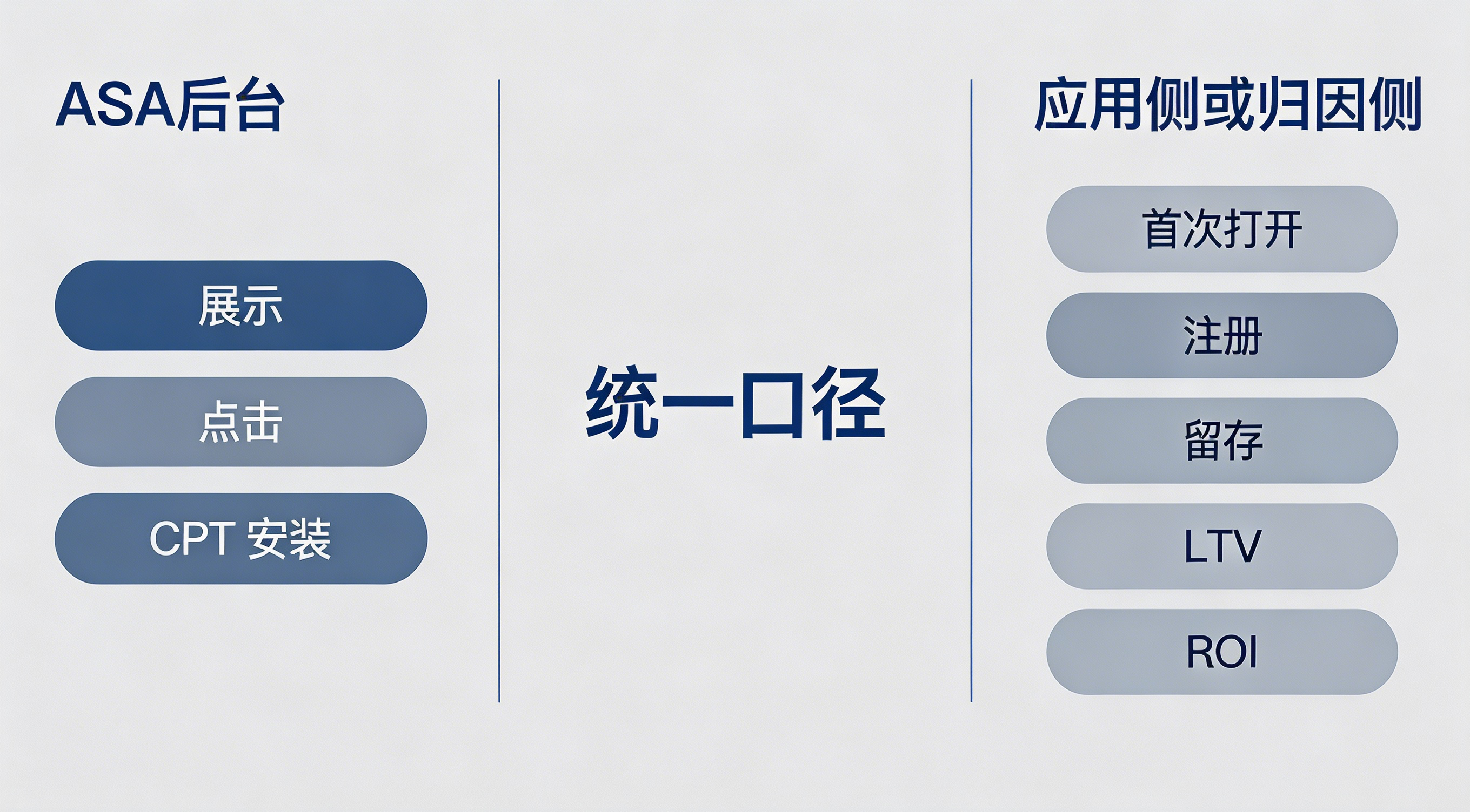 | 只看 ASA 后台 | 展示、点击、安装、CPT 等前链路数据 | 看不到激活、注册、留存、付费质量 | 日常巡检、快速看波动 |