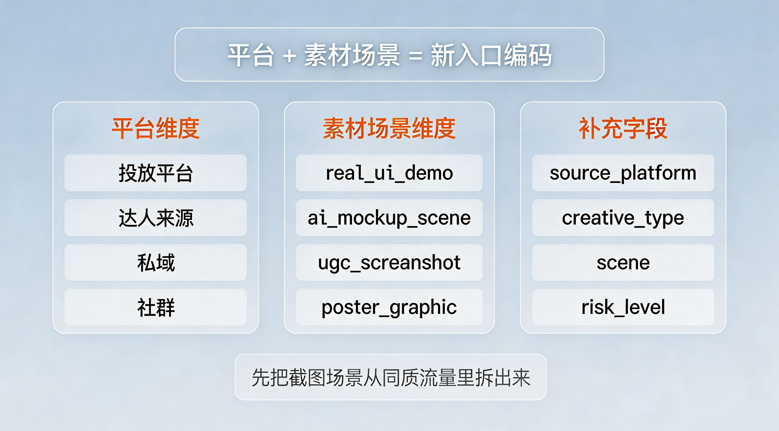 做法:可以借助 渠道编号 ChannelCode 的思路,把渠道编号从“平台维度”扩展到“平台 + 素材场景维度”。例如,同一条投放链路内,可以进一步拆出 real_ui_demo、ai_mockup_scene、ugc_screenshot、poster_graphic 等素材型入口标签,再配合 source_platform、creative_type、scene、risk_level 等字段,让系统至少知道“这次转化是被什么类型的视觉场景触发的”。