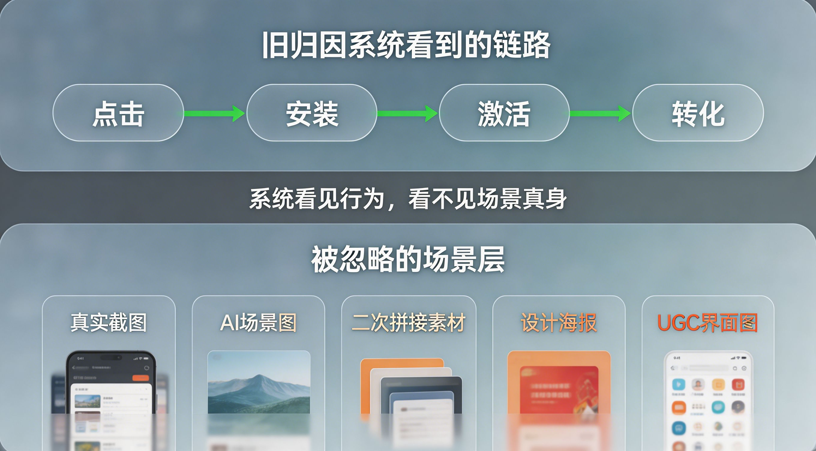 带来的好处:当某类素材突然转化飙升时,团队能判断是产品真实页面更有效,还是 AI 场景图更会制造点击;当某批用户后续留存异常时,也能快速追溯是否某类截图型素材带来了过度承诺或错配预期。对今天的增长系统来说,【场景还原】第一步,不是辨别图真假,而是先把“场景类型”纳入归因体系。