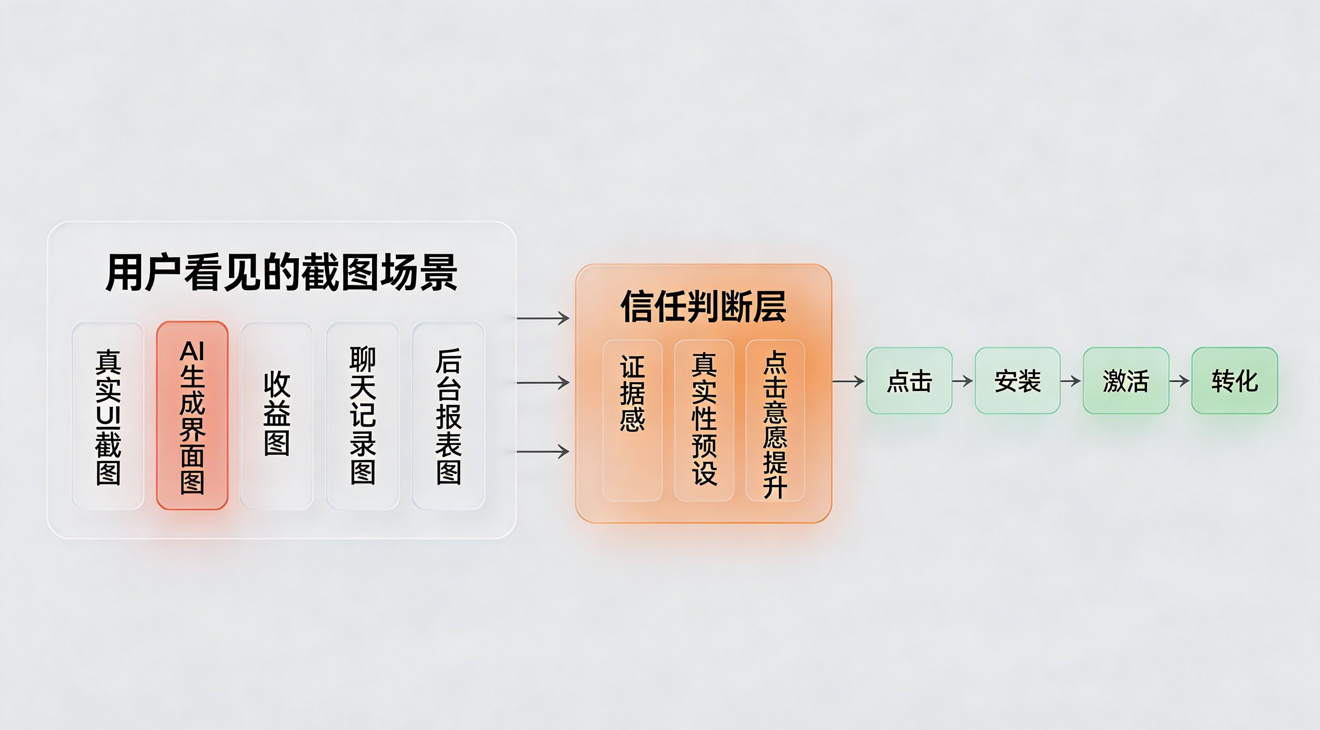 更麻烦的是,截图型流量往往天然带有高意图。用户看到一个“真实到账界面”“真实后台报表”“真实群聊反馈”,他的点击意愿和信任预设本来就会高于普通广告图。所以一旦这种场景被模型高精度伪造,渠道报表看到的转化上升,未必等于产品真实竞争力上升,也可能只是“场景包装能力”提升了。对于 App 团队来说,这就不是内容真假问题,而是增长解释权开始被侵蚀。