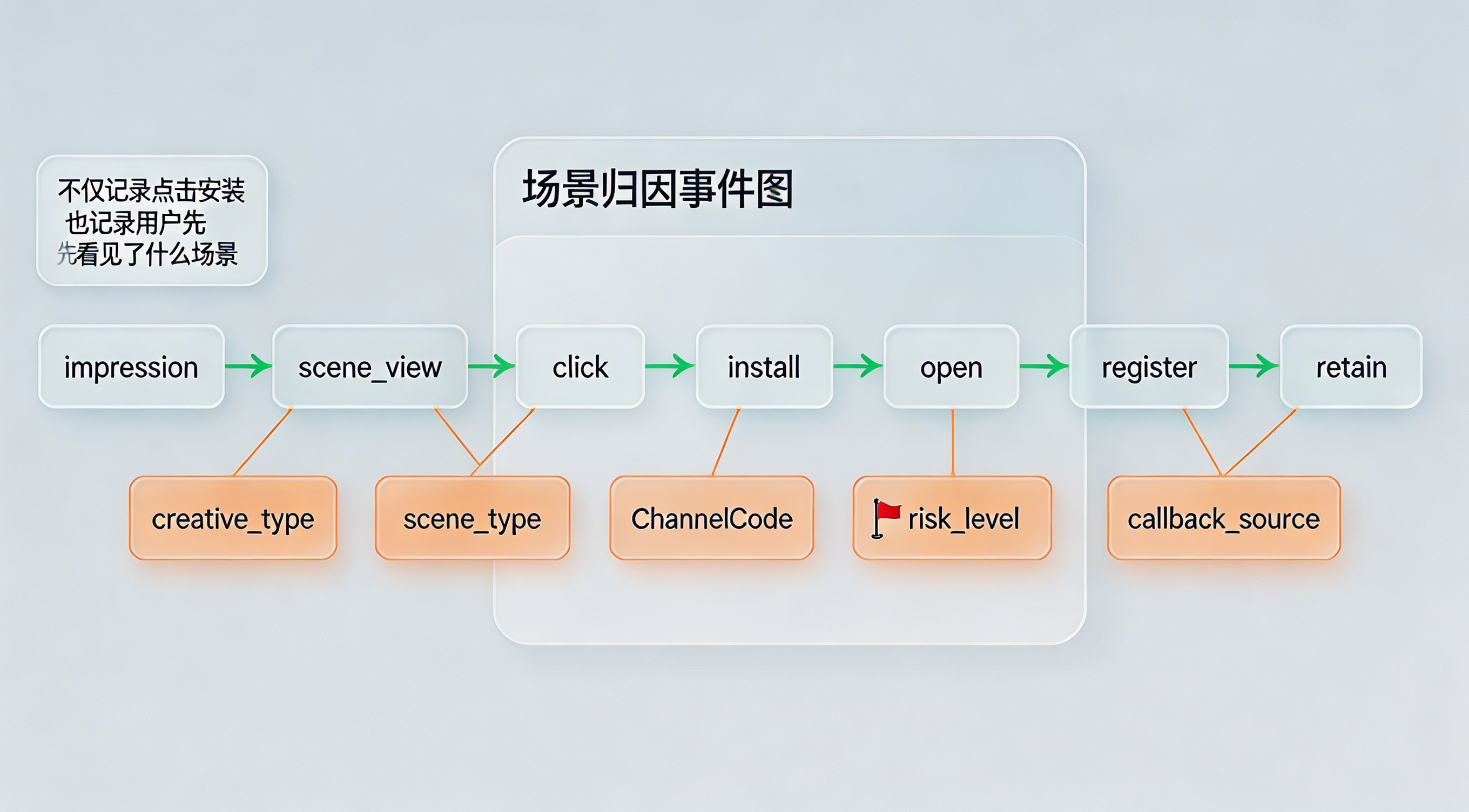 做法:更合适的做法,是把素材场景事件纳入统一事件图。围绕 impression、scene_view、click、install、open、register、retain 等节点建立主路径,并补充 creative_type、scene_type、channelCode、risk_level、callback_source 等字段。