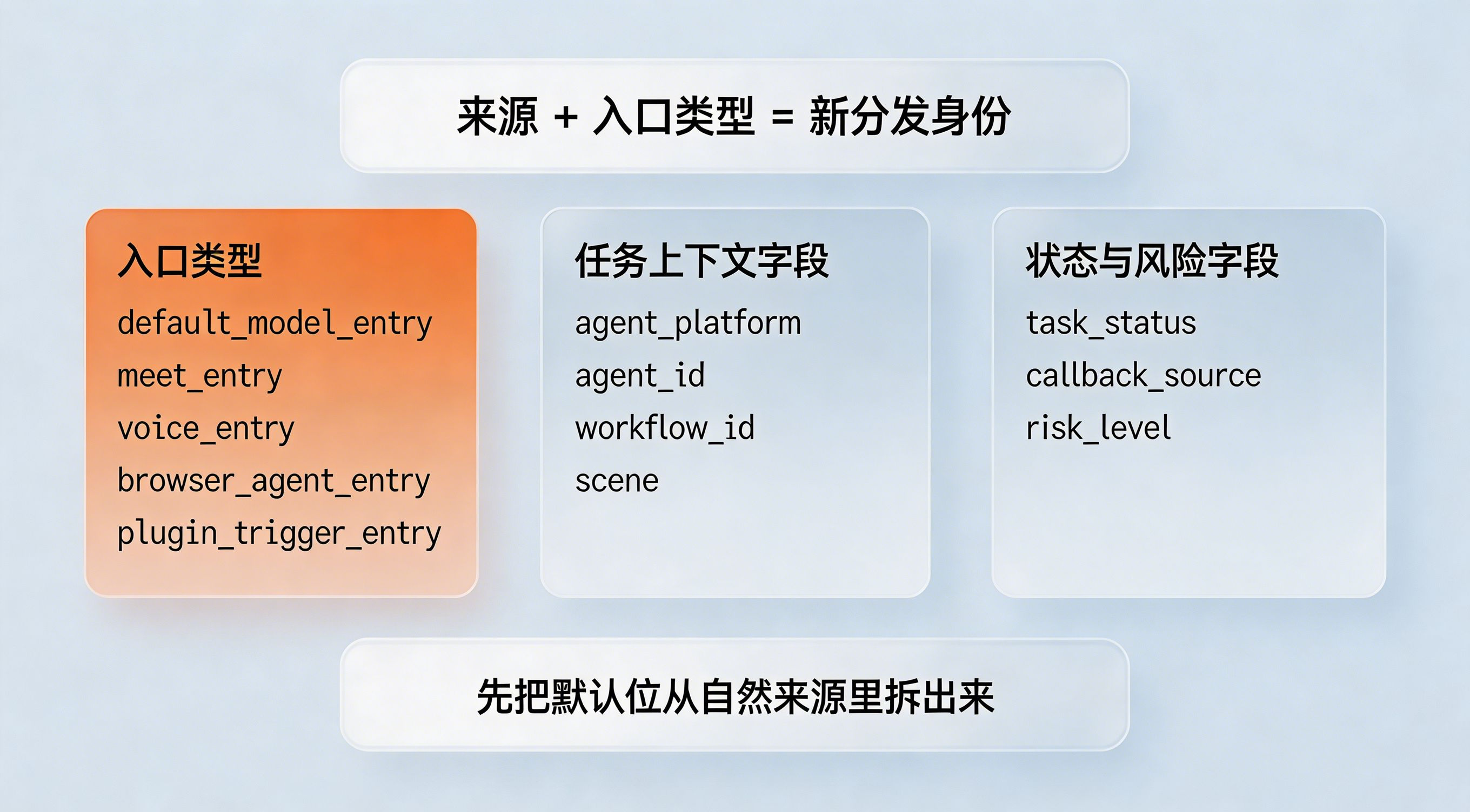 做法:可以借助 渠道编号 ChannelCode 的思路,把渠道从“投放来源”扩展为“来源 + 入口类型”的组合身份。例如,将 default_model_entry、meet_entry、voice_entry、browser_agent_entry、plugin_trigger_entry 等纳入统一编号体系,再补充 agent_platform、agent_id、workflow_id、scene、risk_level 等字段。这样,平台看到的不只是“OpenClaw 带来一次行为”,而是“OpenClaw 里的哪一类入口带来了哪一种任务”。
