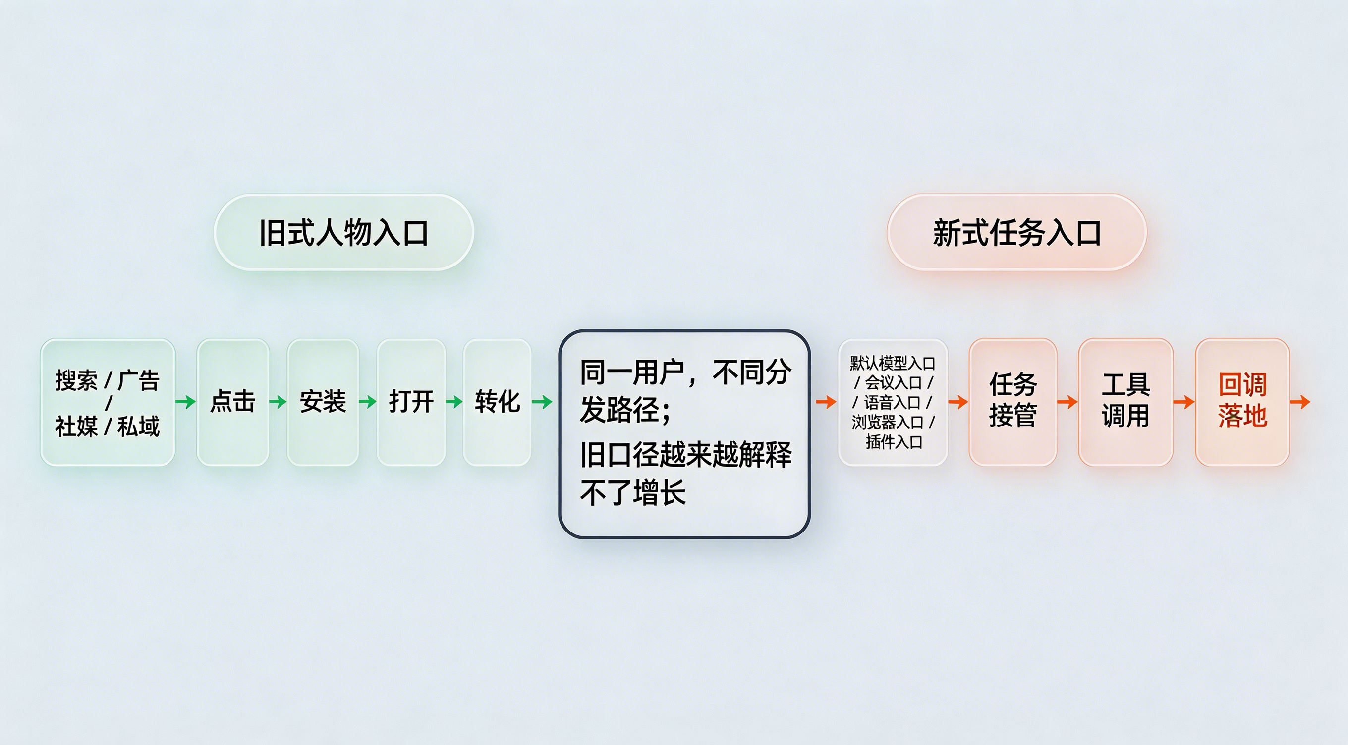 带来的好处:产品团队能按任务场景做差异化承接,增长团队能识别默认位带来的任务和用户主动行为的差异,数据团队则能把激活、留存和回访放回原始任务语境里理解。注:本文讨论的部分跨 Agent 平台上下文承接、复杂任务链路参数还原等方向,属于对未来分发趋势的前瞻性技术延展与思考,例如私域任务链识别、跨平台一键拉起、多入口任务承接等。此类高度定制化链路在不同业务中的成熟度不一,具体推进仍需结合实际系统架构评估。