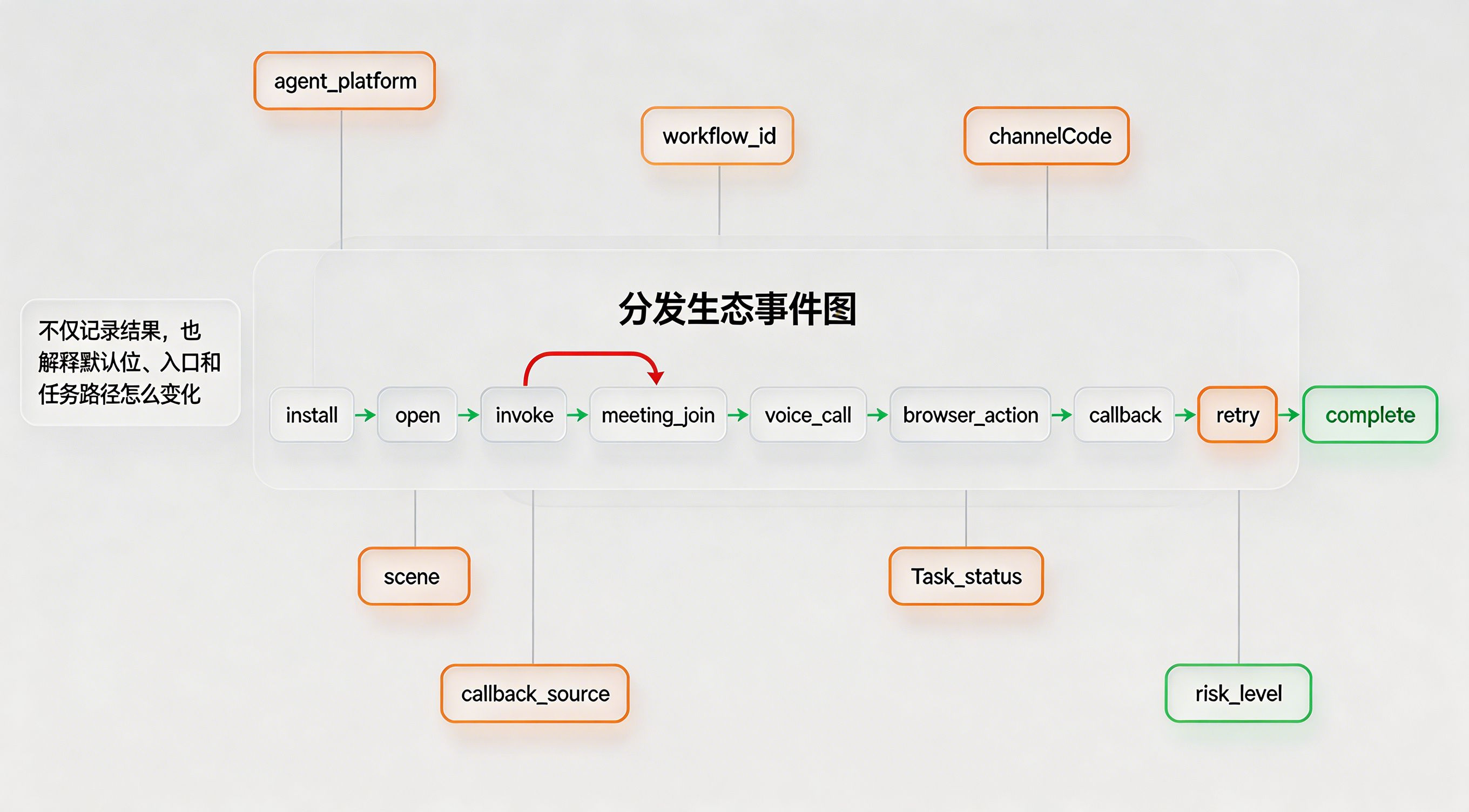 做法:需要在数据层建立统一事件图,把人物流量和任务流量放到一个框架中看。围绕 install、open、invoke、meeting_join、voice_call、browser_action、callback、retry、complete 等节点建模,并补充 agent_platform、workflow_id、channelCode、scene、task_status、callback_source、risk_level 等字段。对于多平台、多云、多 Agent 的复杂场景,也可以参考 xinstall 在《亚马逊 AI 战略升级?多云多 Agent 时代 App 该怎么认清流量真身》和《OpenClaw 引爆智能体分发:AI 个人助理重构 App 参数传参安装范式》中提到的思路:不要只看用户从哪里来,更要看任务从哪里来、经过哪里、最终落到哪里。