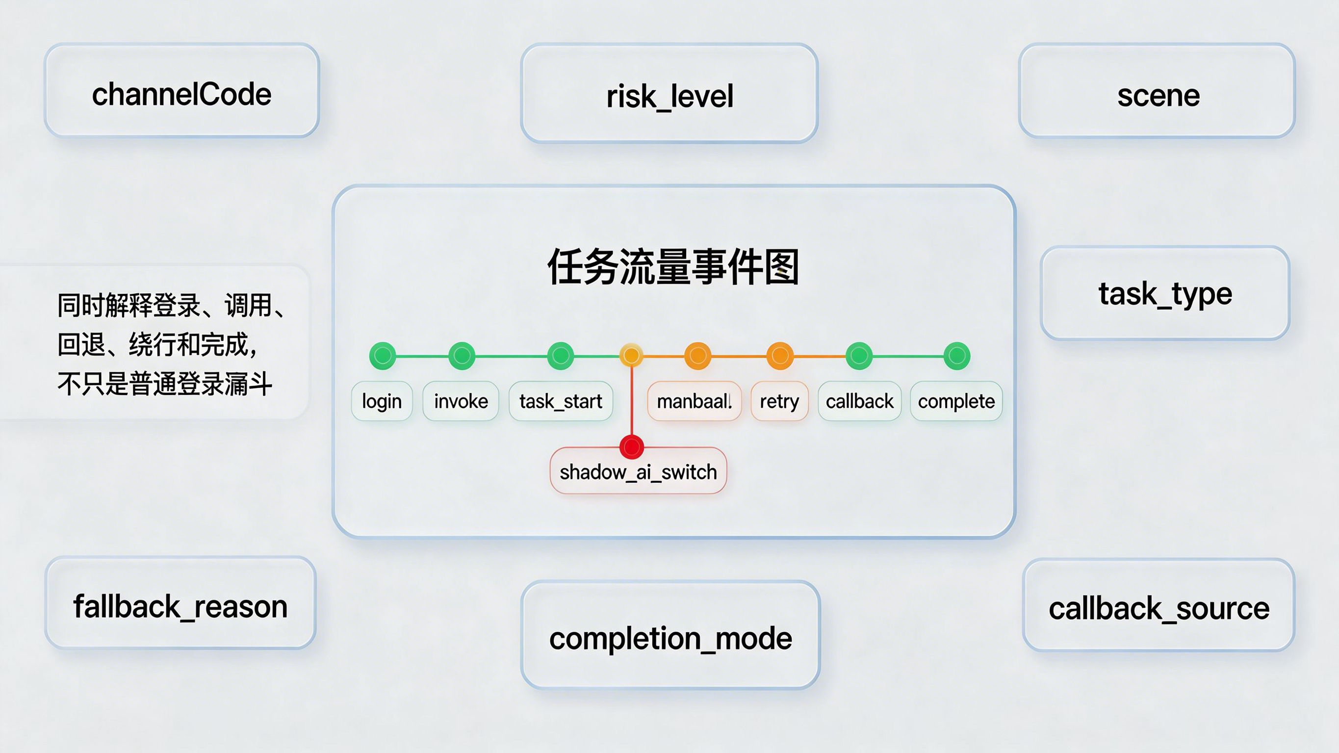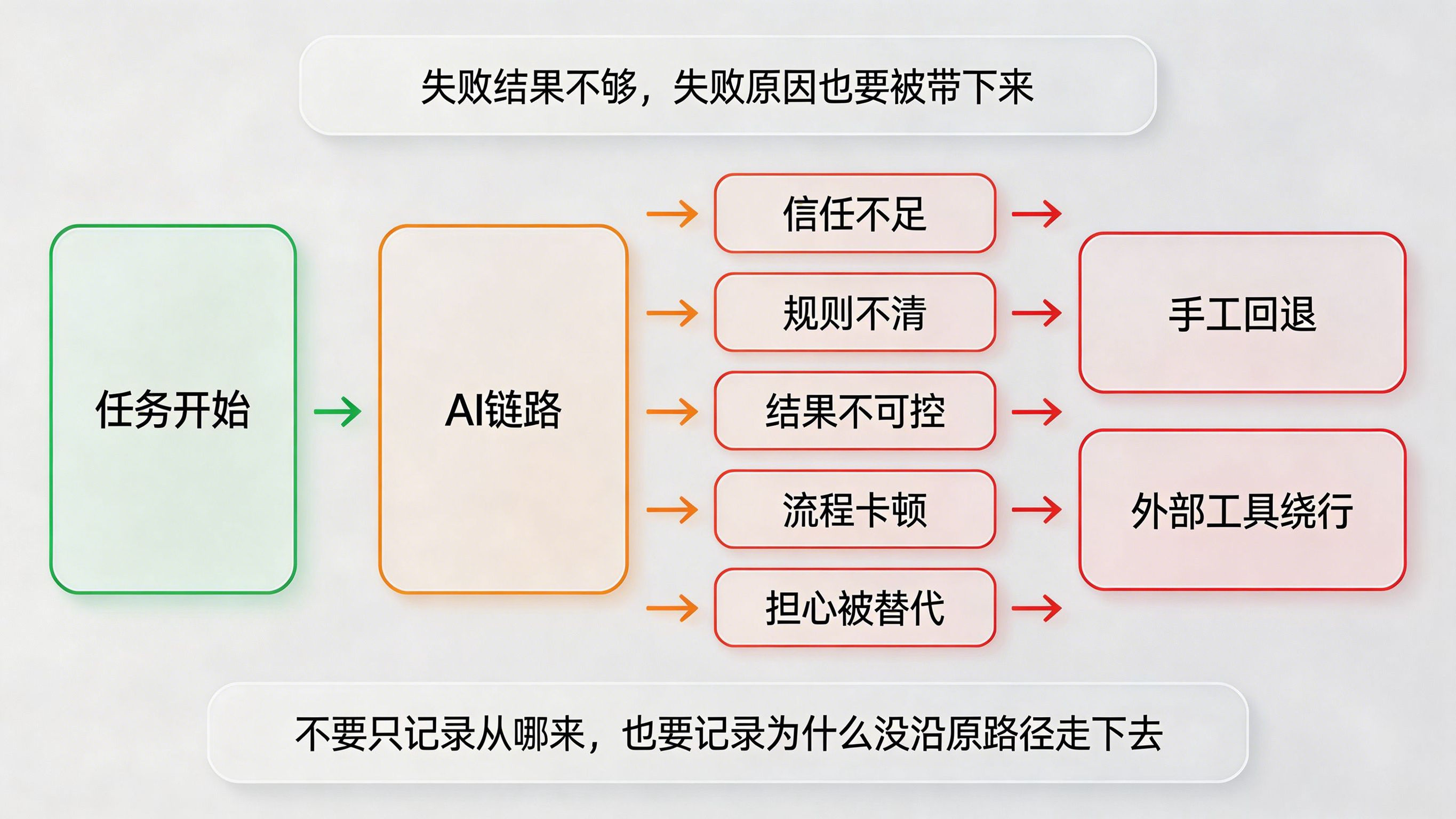 问题:企业最容易丢掉的信息,不是有没有发生任务,而是“为什么这次没走 AI”“为什么中途切回手工”“为什么员工放弃了官方链路”。如果这些原因在链路中途丢失,后续就只能看到失败结果,却看不到失败上下文。