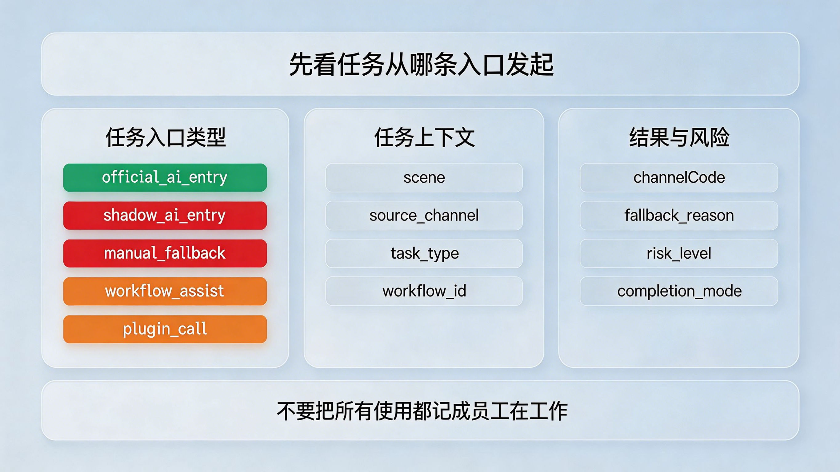 问题:很多企业在内部推广 AI 工具时,只会按部门、席位、产品模块做粗粒度统计,却不会把“任务究竟从哪个入口发起”单独建身份。结果是,来自官方 Copilot、内部助手、外部 ChatGPT、个人 Claude 账号、手工流程的任务,最后都被混成“员工在工作”。