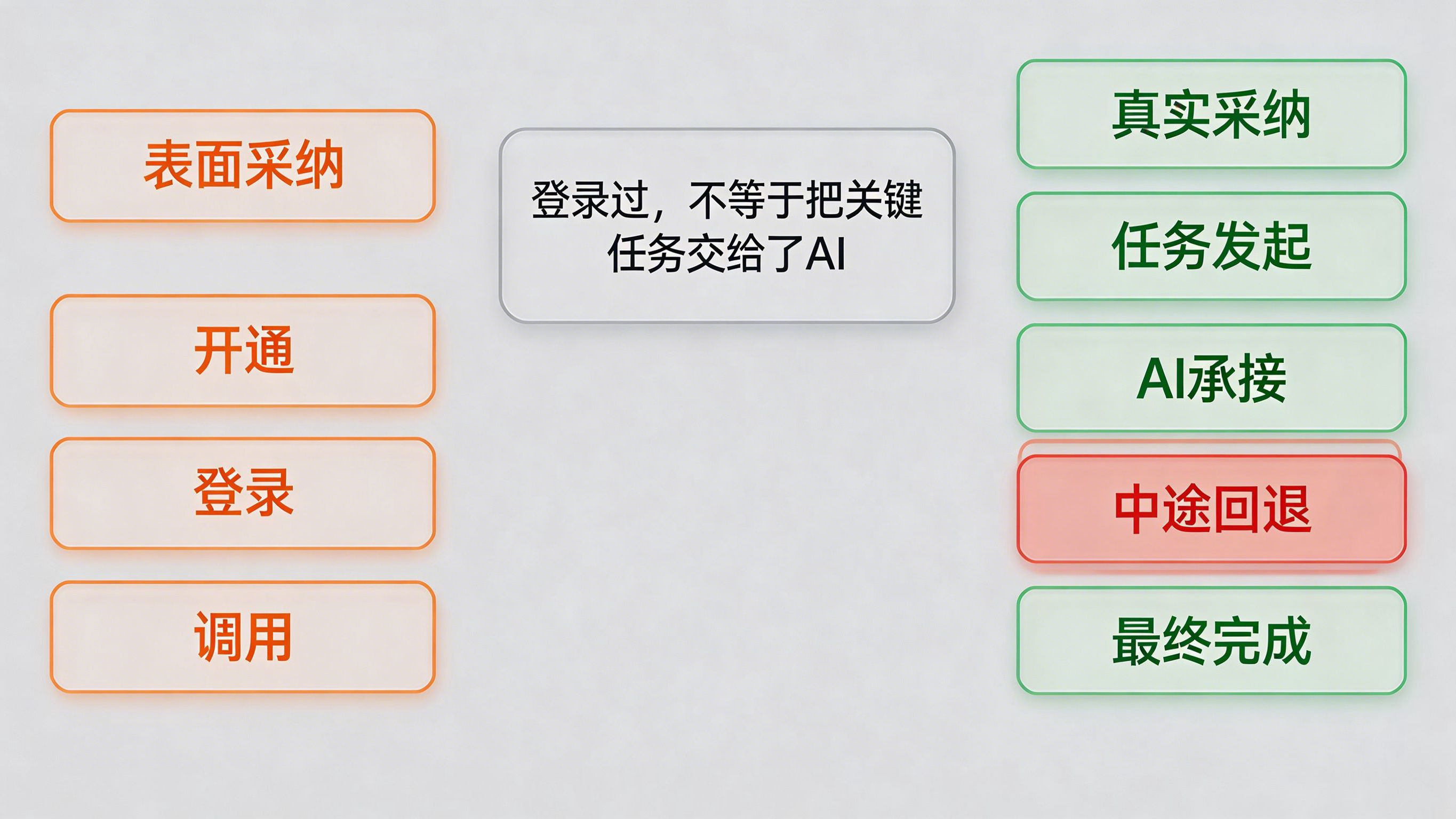 增长团队在企业 AI 里最容易犯的错,就是看到席位开通、日活上升、调用量增长,就直接判断产品已跑通。可这篇材料已经说明,很多企业里真正的问题不是“员工有没有碰过工具”,而是“员工有没有把关键任务交给工具”。