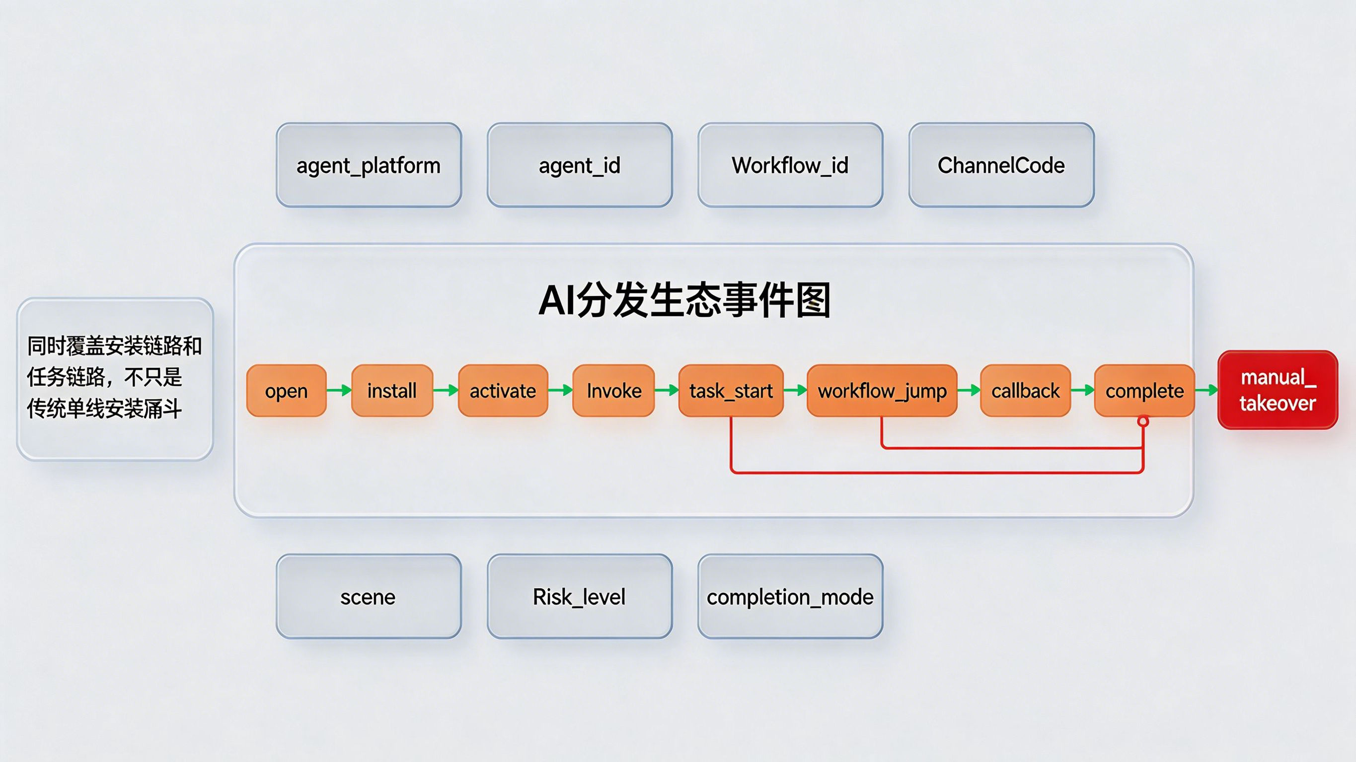 做法:数据层需要建立新的事件模型,把人物行为和任务行为同时纳入。比如围绕 open、install、activate、invoke、task_start、workflow_jump、callback、complete、manual_takeover 等节点建模,并增加 agent_platform、agent_id、workflow_id、channelCode、scene、risk_level 等字段。对于这类多系统链路,也可结合 xinstall 过往在《亚马逊 AI 战略升级?多云多 Agent 时代 App 该怎么认清流量真身》和《OpenClaw 引爆智能体分发:AI 个人助理重构 App 参数传参安装范式》中的分析思路,把模型入口、安装链路和回流事件统一观察。