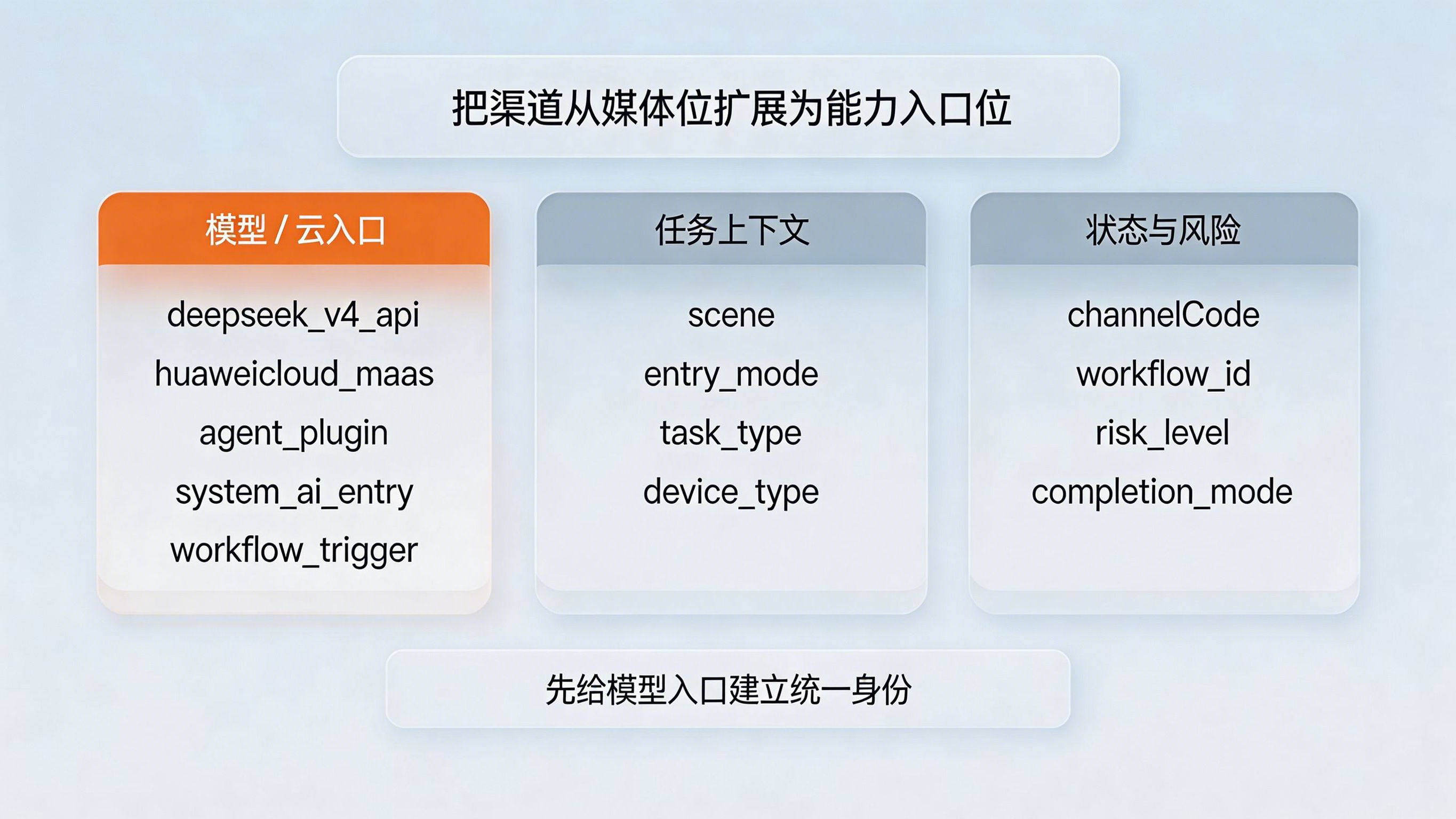 做法:这时就需要用渠道编号 ChannelCode的思路,把“渠道”从传统媒体位扩展为“能力入口位”。例如,可按 deepseek_v4_api、huaweicloud_maas、agent_plugin、system_ai_entry、workflow_trigger 这类方式管理入口编号,同时附加 scene、entry_mode、task_type、device_type、risk_level 等字段。这样,团队统计的就不只是“哪个渠道来的人”,而是“哪个 AI 入口发起了这次业务触达”。