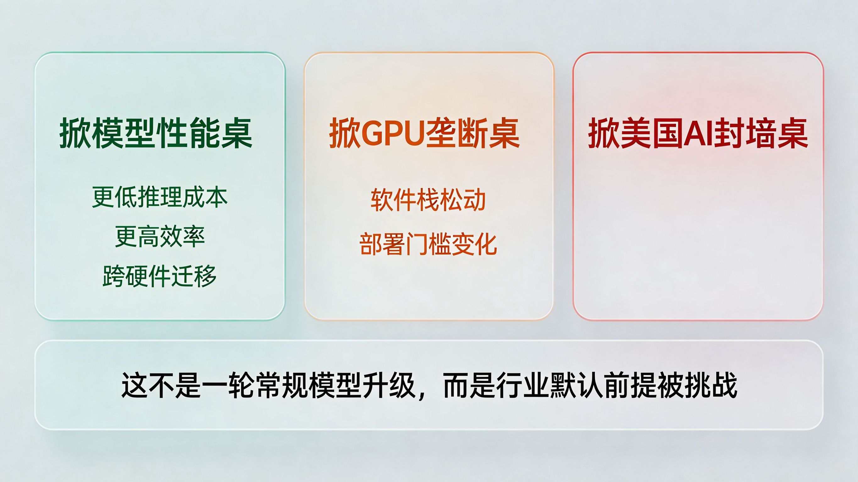 从你提供的材料看,这轮讨论的中心并不只是 DeepSeek-V4 发布了,而是它被赋予了“三重掀桌”的意义:掀模型性能桌、掀 GPU 垄断桌、掀美国 AI 封堵桌。报道之所以强调“梁文锋这一次要掀桌”,核心就在于 DeepSeek 不再只是做一轮常规版本升级,而是在试图改变大模型行业默认接受的一些前提。