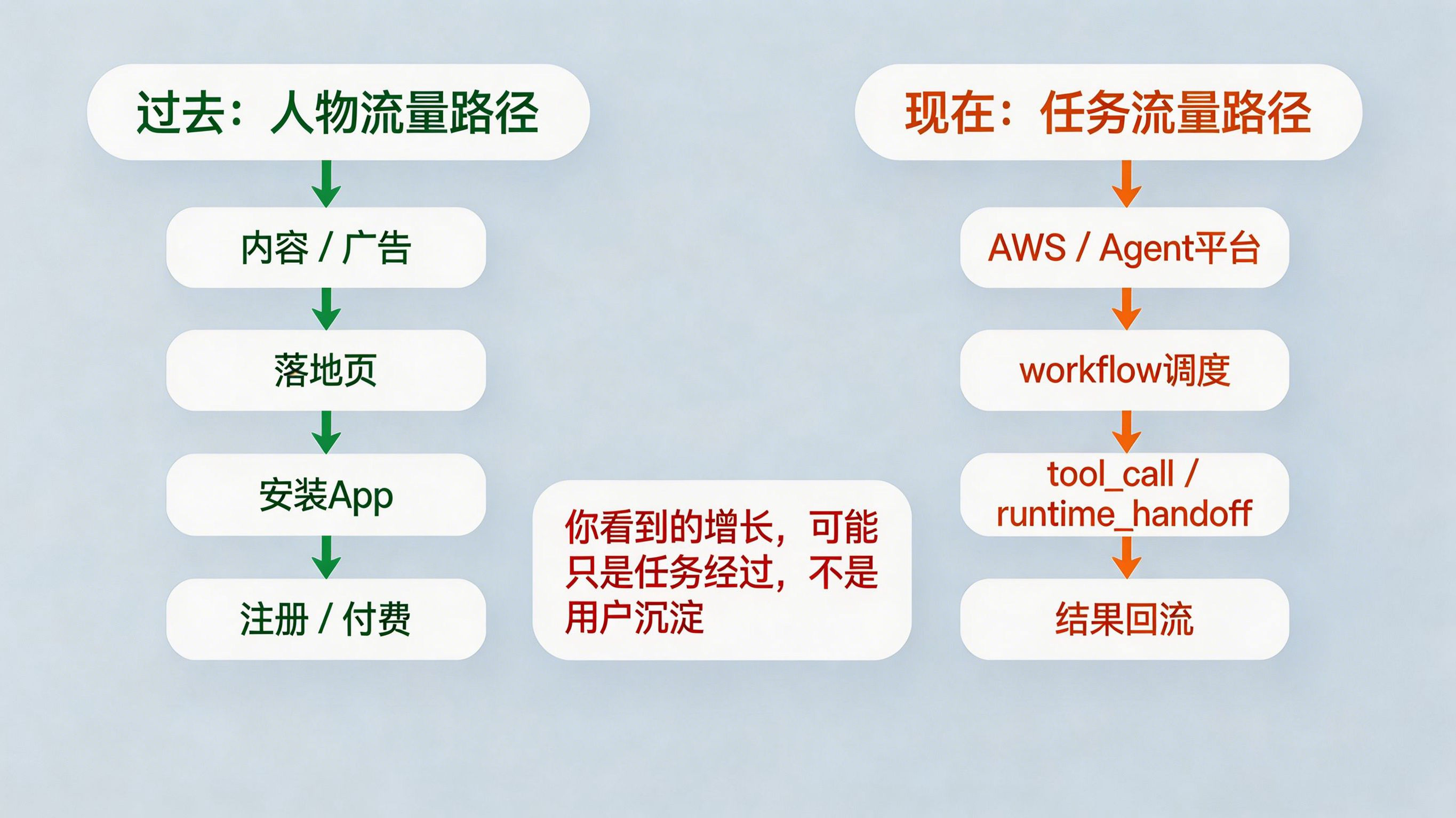 因为未来很多 App 服务不是被用户直接打开,而是被平台任务流、Agent 或企业工作流间接调用。这样一来,真正进入你系统的可能是一条任务,而不是一个明确点击过页面的用户,归因对象自然就更复杂。