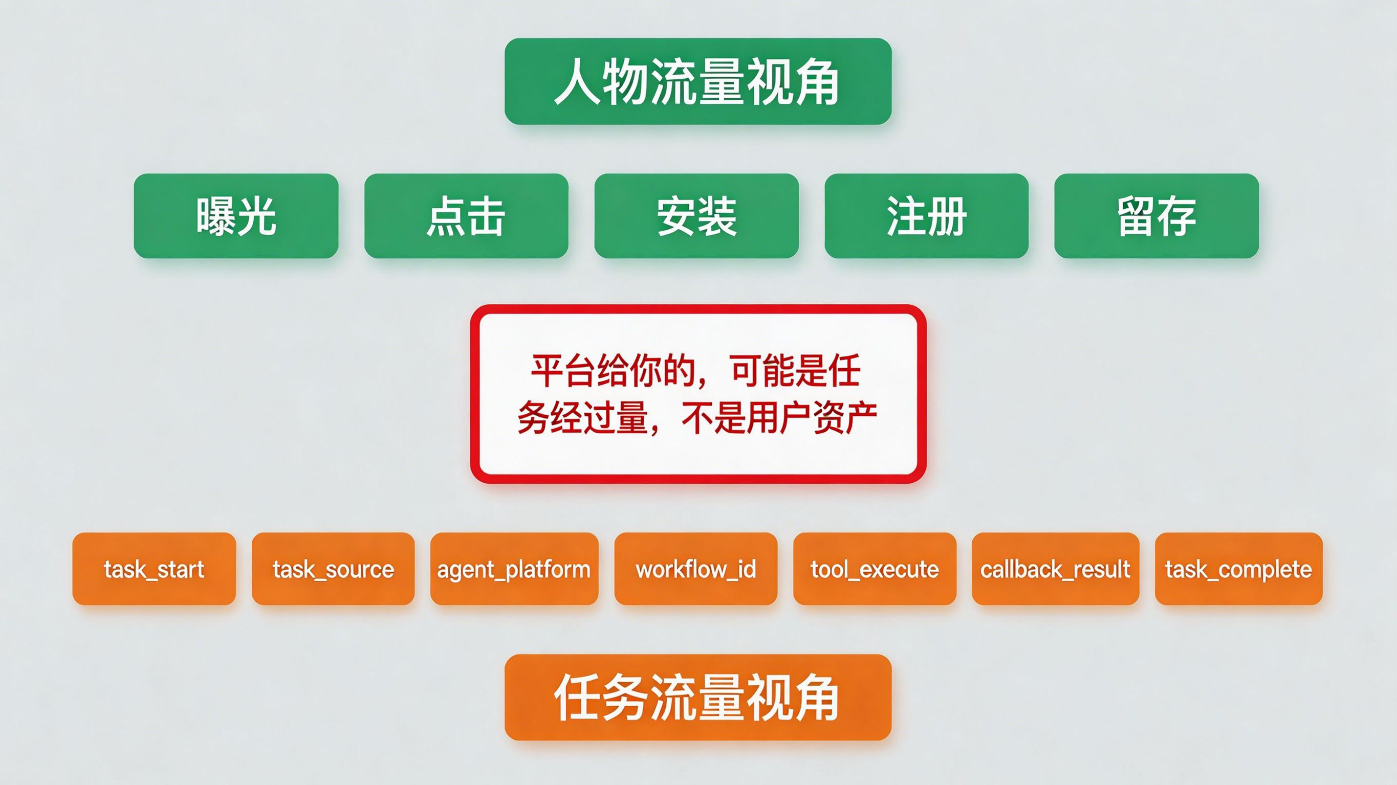 问题:传统漏斗里,最常见的事件是 page_view、click、install、login、pay。可一旦任务流量成为现实,这套模型就会越来越看不懂平台内发生了什么。因为真正重要的动作可能是 task_create、agent_assign、tool_call、runtime_handoff、result_callback,而不是页面点击本身。
