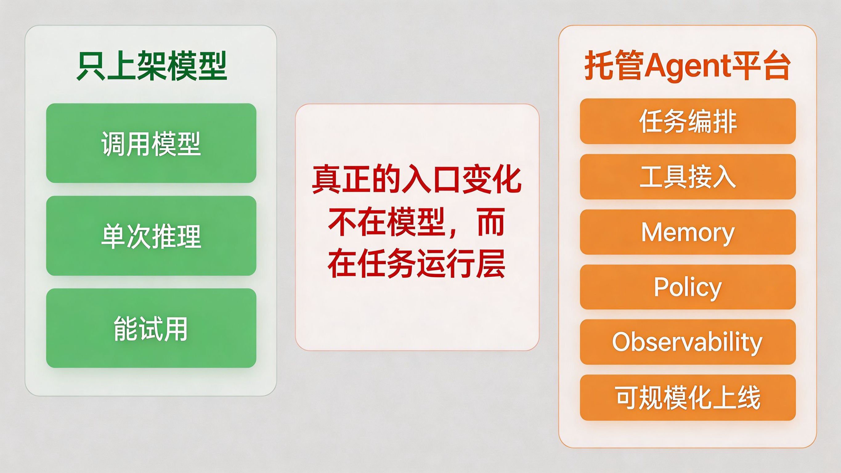普通 API 更像“给你一个模型接口,其他事情自己拼”。Bedrock Managed Agents 则更接近“平台帮你提供一套可运行的智能体基础设施”,包括任务编排、工具接入、安全控制和运行观测等。它的重点不是单次对话,而是生产级任务执行。