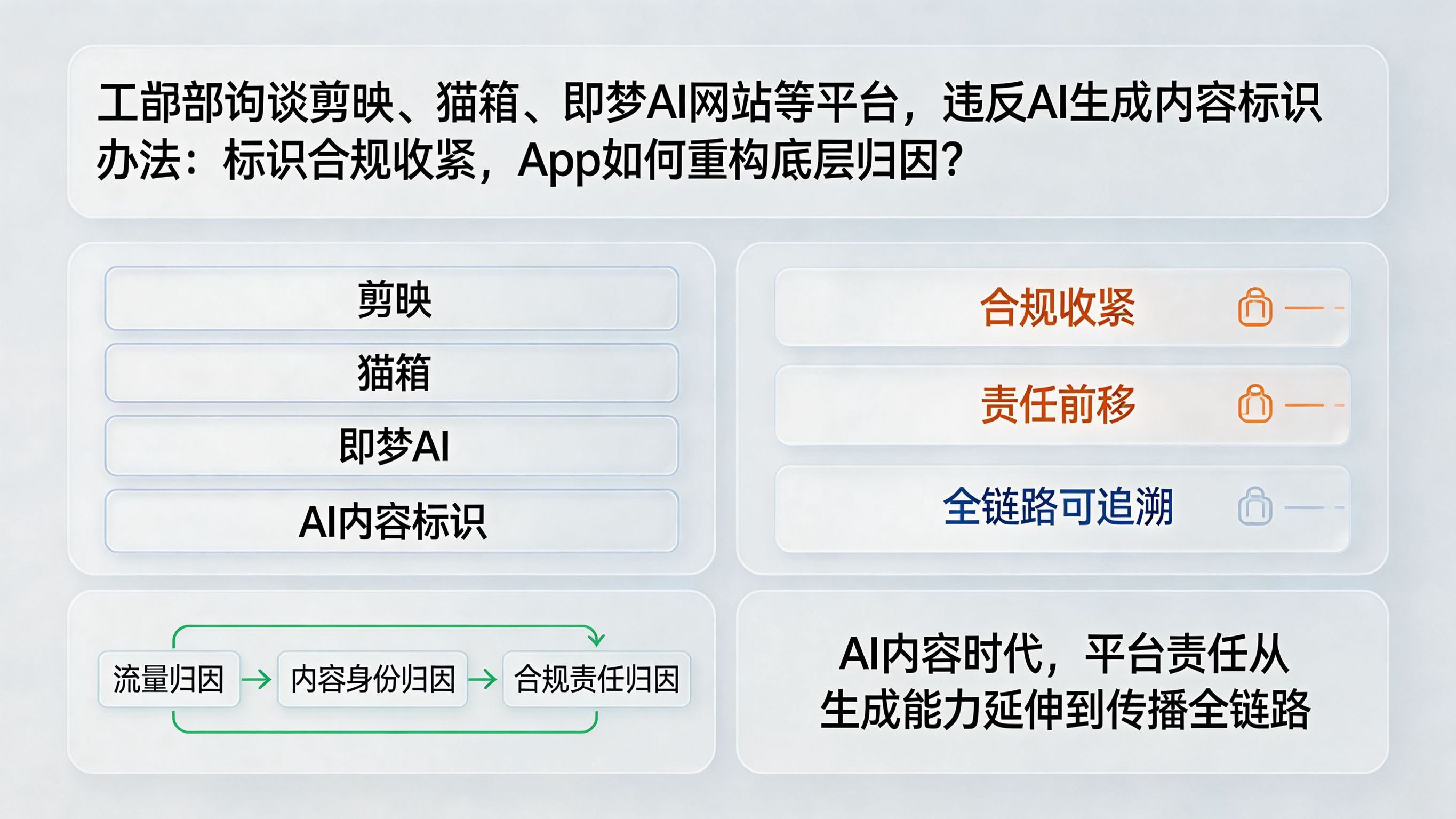 工信部约谈剪映、猫箱、即梦AI网站等平台,违反AI生成内容标识办法:标识合规收紧,App如何重构底层归因?