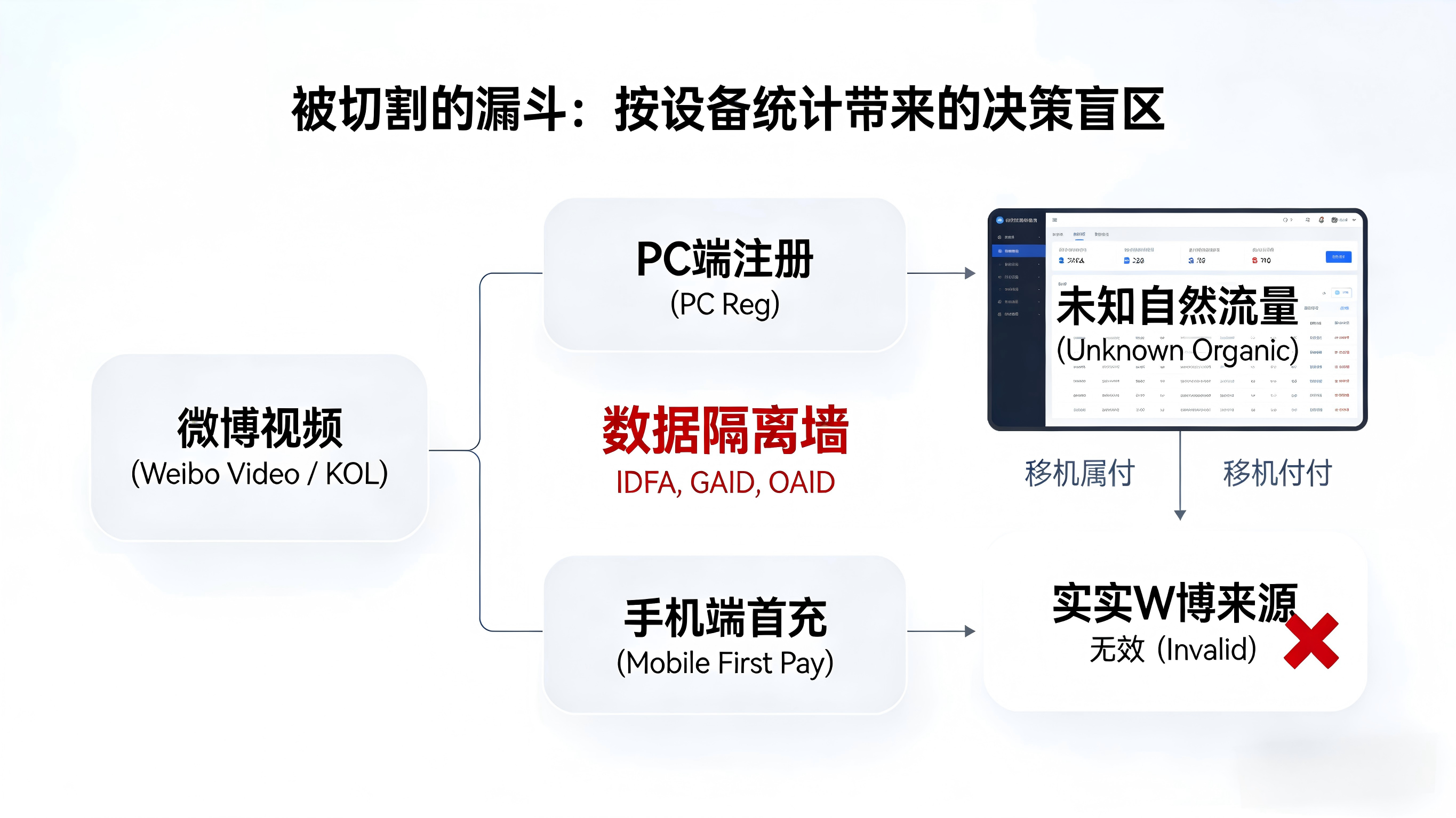 在这条链路里,来源是微博短视频,第一次激活是 PC 端,首付设备是安卓手机,但负责统计数据的同事如果只看手机端的安装数据,微博这条渠道很可能会被误判为"无效",导致后续投放决策出错。这就是多端互通带来的归因盲区:用户在不同设备间自由流转,而归因系统却在按设备切割来统计。