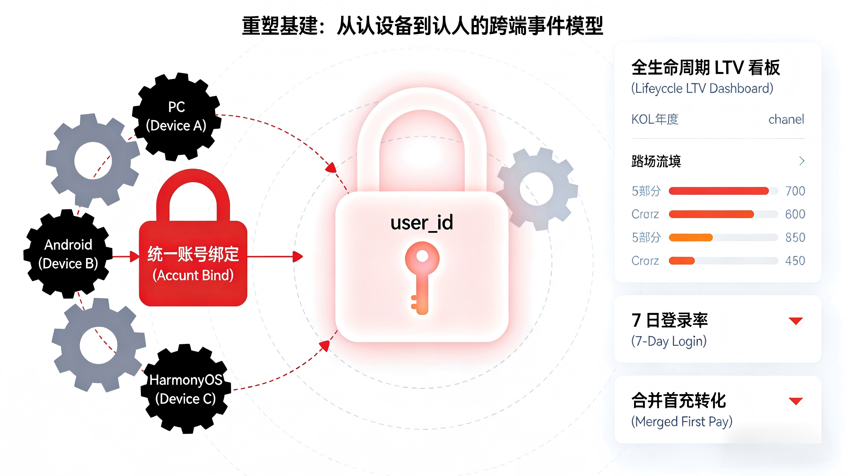 全平台互通的最终挑战,是要在数据层面从"以设备为中心"切换到"以用户为中心"。当同一个人用 PC 端激活、手机端活跃、平板端付费时,这三段行为如果彼此孤立,增长团队会对这个用户的真实价值产生严重低估。