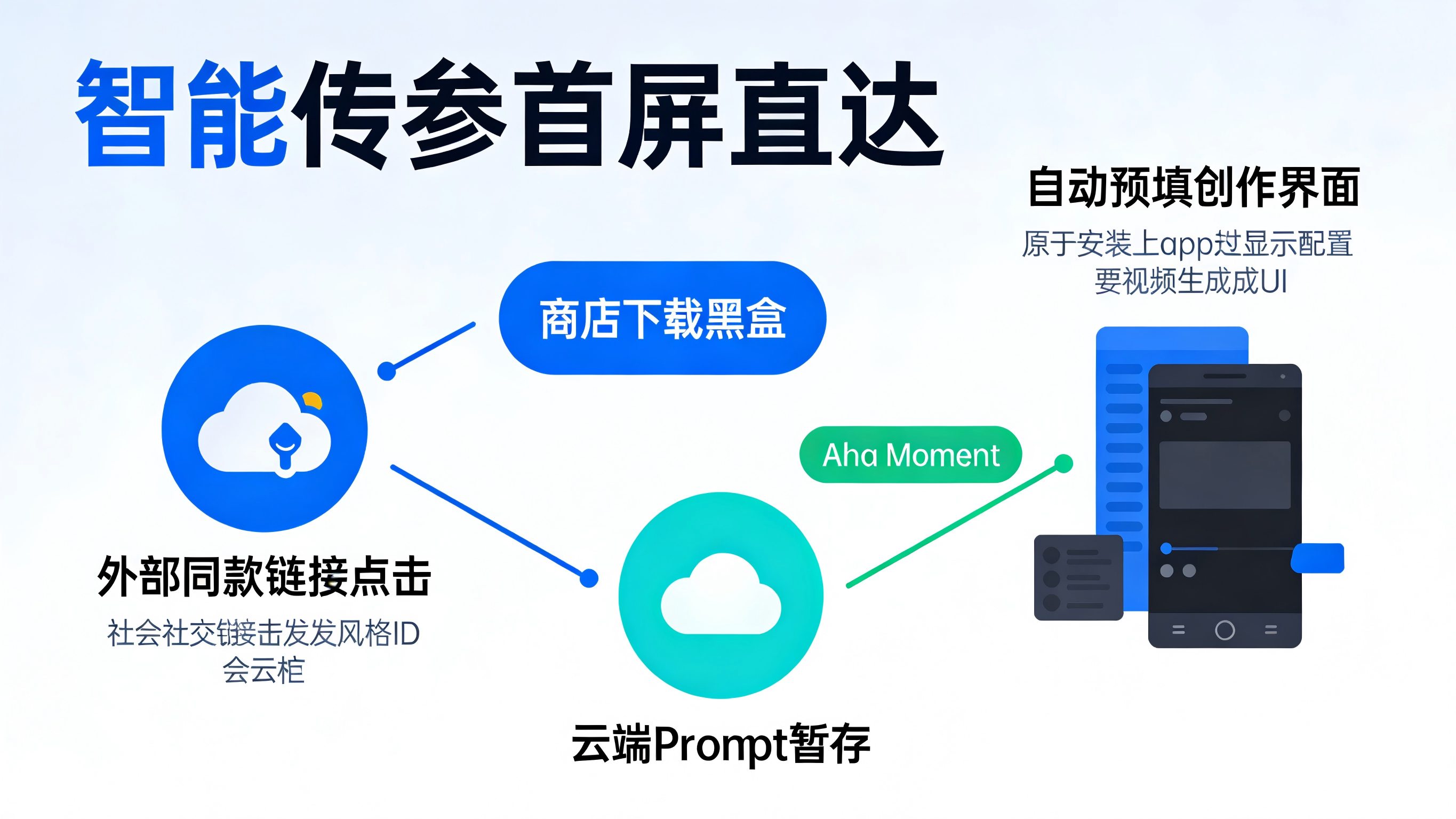 当一个短视频创作者在外部点击“使用即梦/可灵生成此风格视频”的专属链接后,这套技术会将具体的风格 ID、Prompt 参数暂存在服务器。当用户完成下载并首次打开 App 时,应用可以自动获取这些参数,跳过繁琐的冷启动步骤,直接将用户带入已经配置好该风格和参数的创作界面。