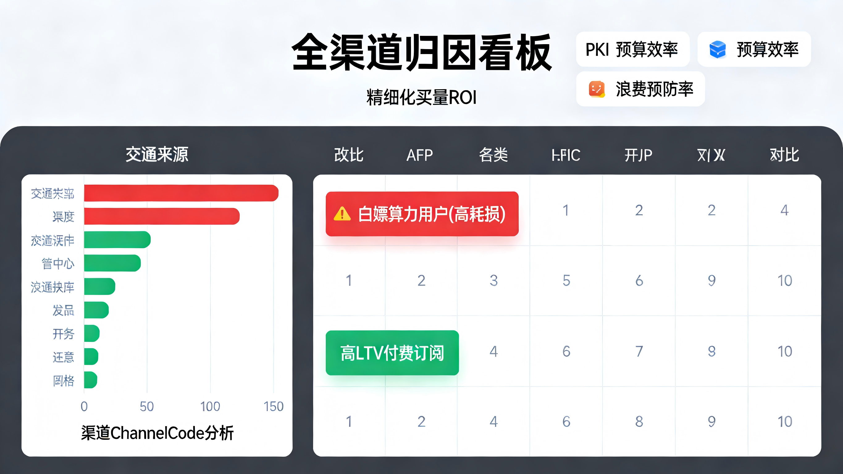 AI 应用需要精细化的买量系统。利用渠道编号(ChannelCode),开发者可以在不同维度的投放(如 Facebook 广告、科技博主推荐、社群分发)中生成独立标识。结合底层的综合模糊匹配技术,App 的运营团队能在后台清晰地看到:哪些渠道带来的用户只是在“白嫖算力”,哪些渠道的用户转化为了付费会员。从而及时调整预算,避免重蹈 Sora 的覆辙。
