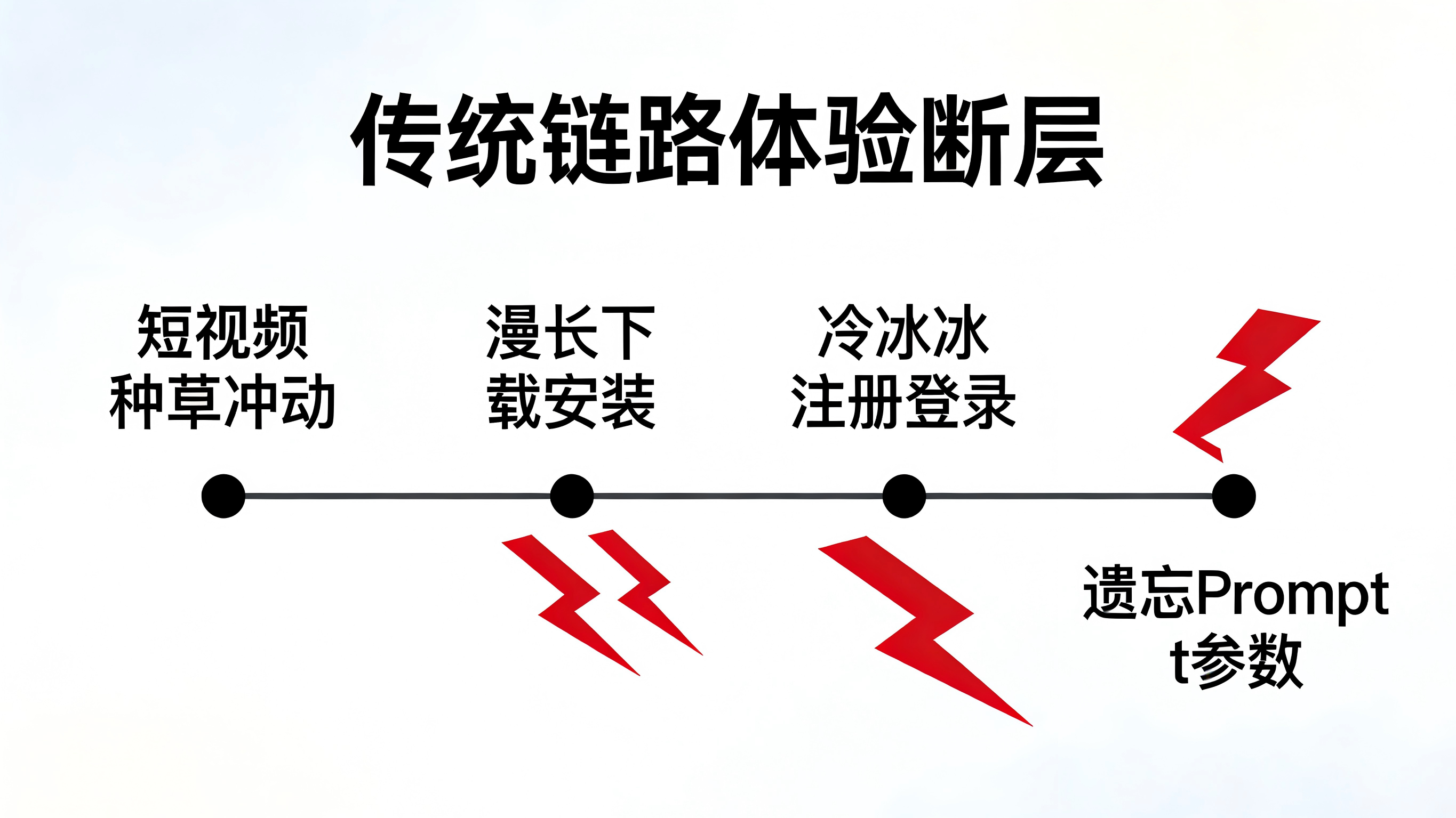 目前的 AI 应用推广往往面临一个巨大的体验断层。当用户在 TikTok 或抖音上刷到一条极其震撼的 AI 生成视频,或者看到一个极具吸引力的“一键同款”广告时,他们的原始意图是非常明确且强烈的。但是,传统的应用分发链路是极其生硬的:
