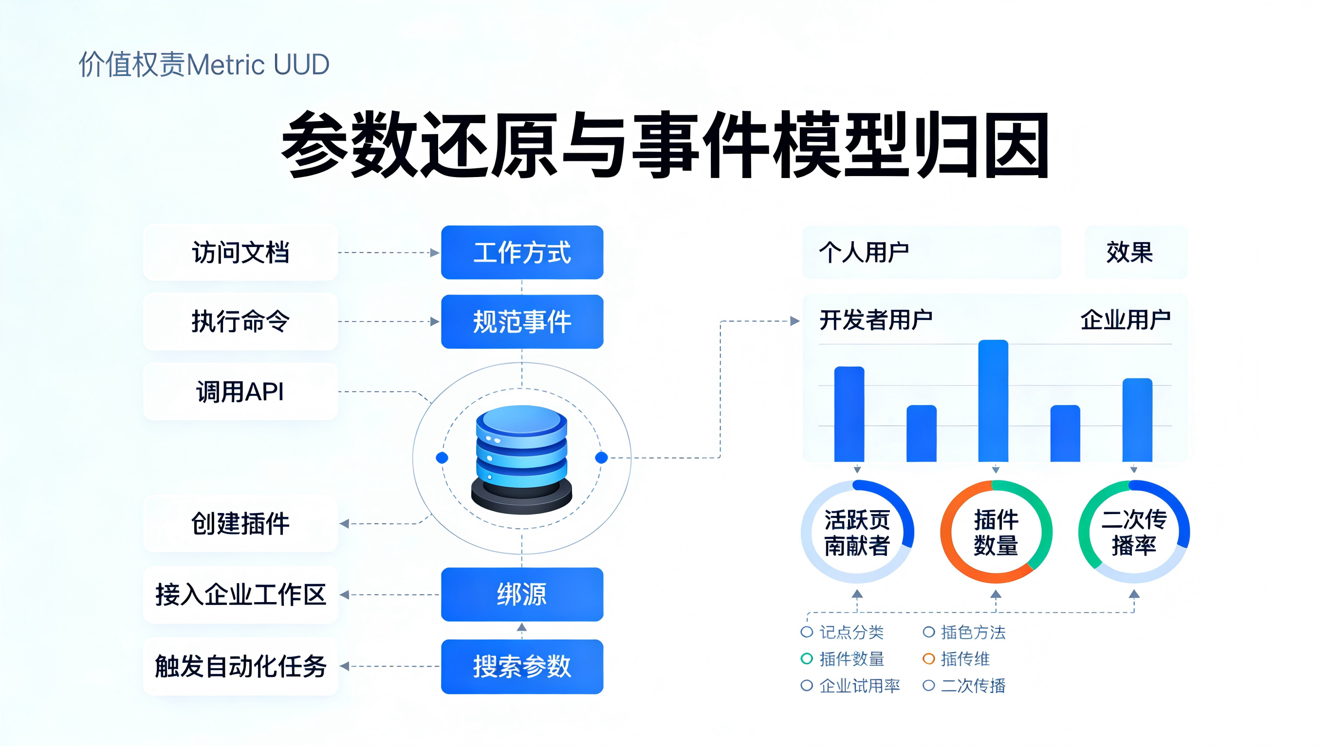 做法上,可以把“访问文档、执行命令、调用 API、创建插件、接入企业工作区、触发自动化任务”这些动作都沉淀为统一事件,再和原始来源参数绑定,形成一张跨终端、跨场景的事件图。这样,产品团队能看出用户是停留在尝鲜阶段,还是已经变成了生态贡献者。