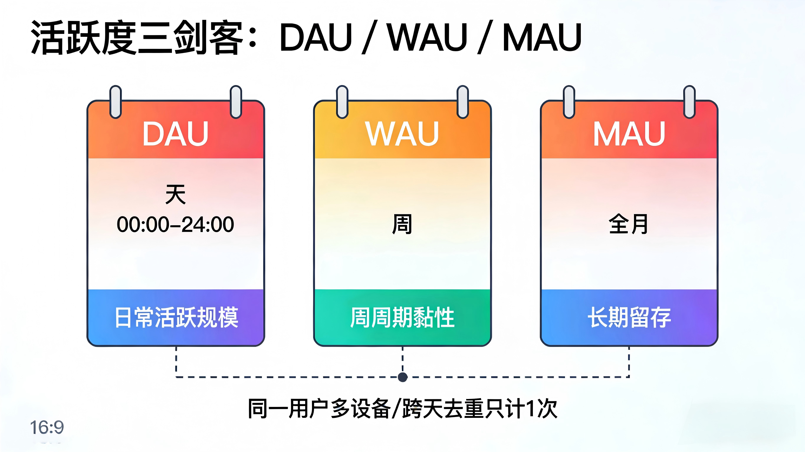 | DAU | 日独立用户 | 00:00–24:00 | 日常活跃规模 |