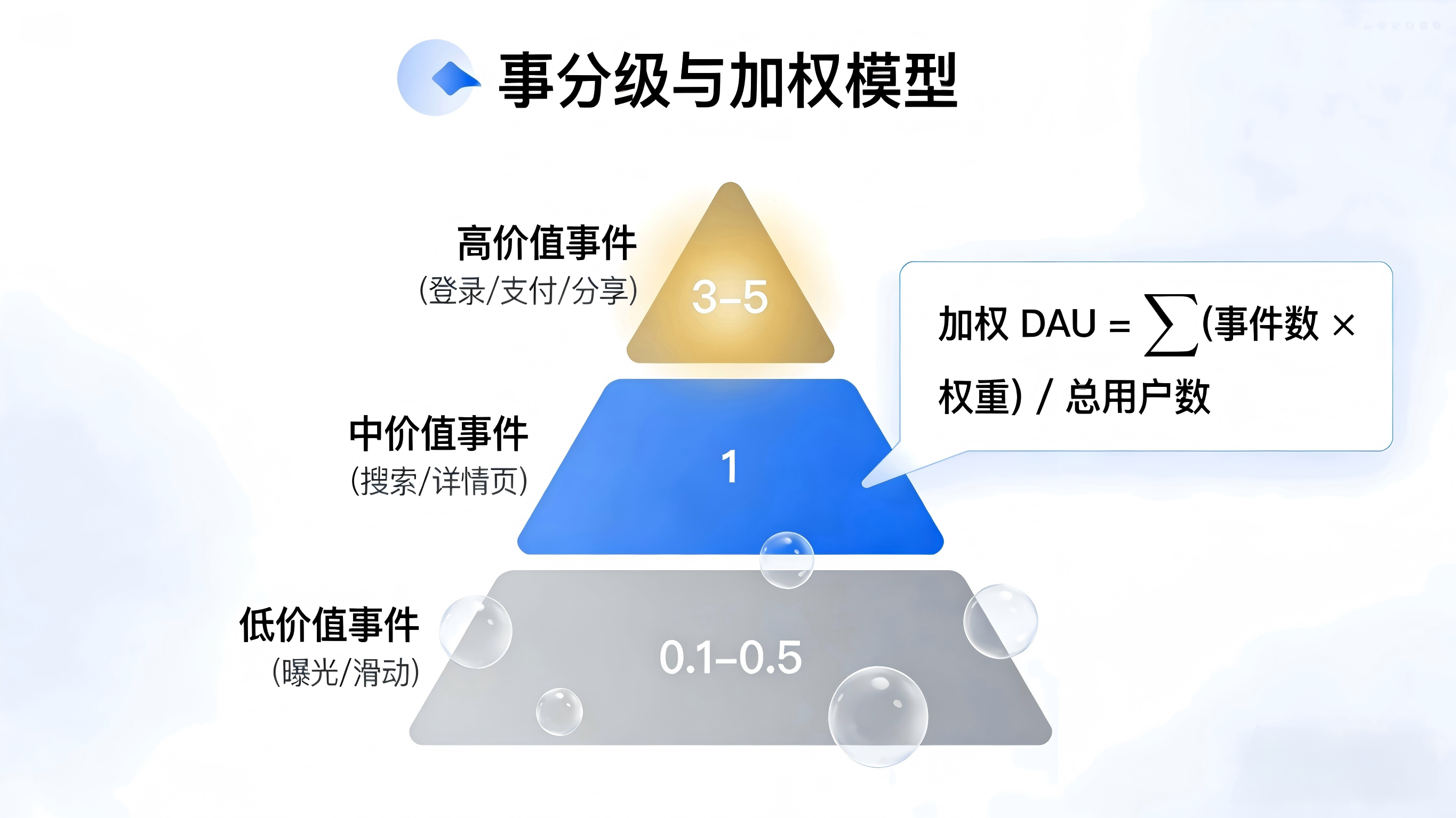 [ \text{加权 DAU} = \sum (\text{用户事件数} \times \text{事件权重}) / \text{总用户数} ]