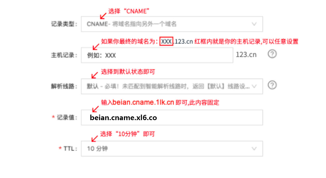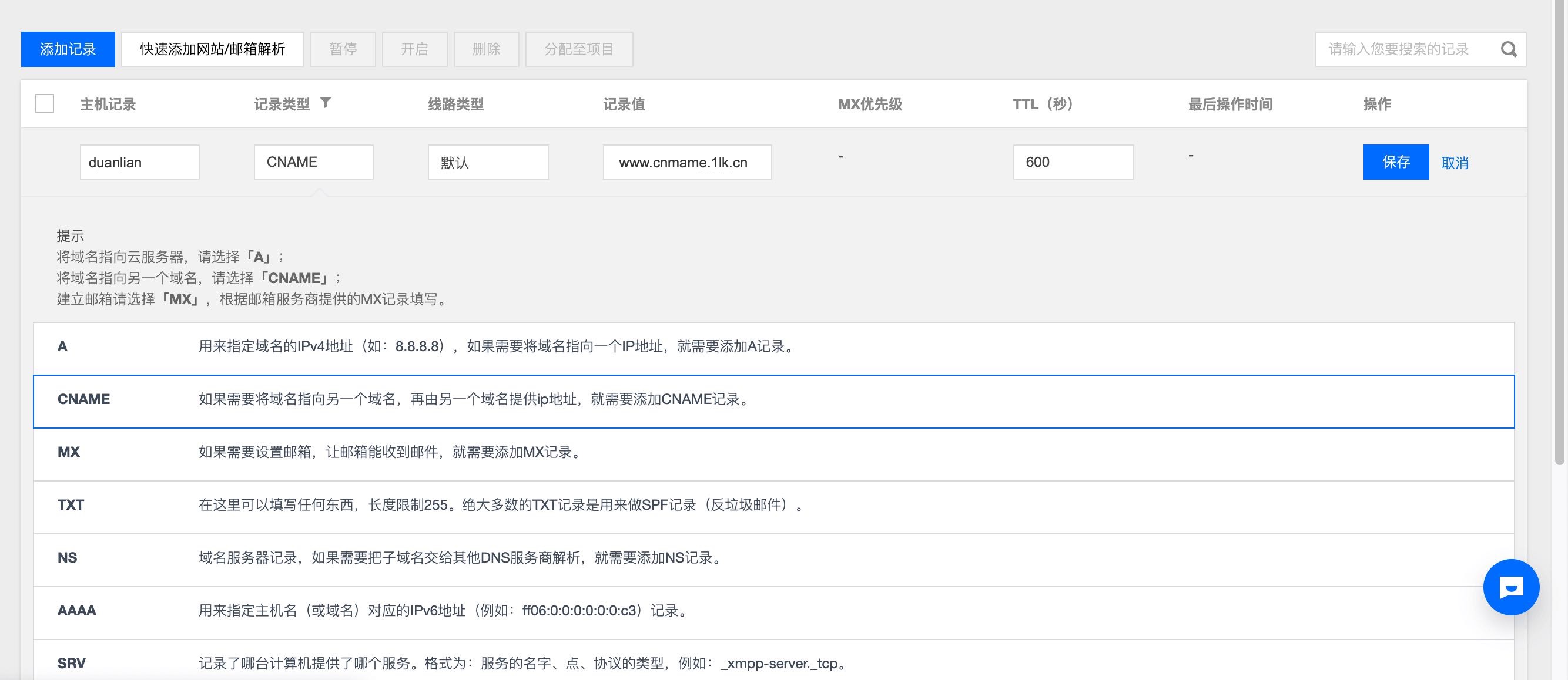 2.配置记录类型为 CNAME,输入主机记录及记录值
