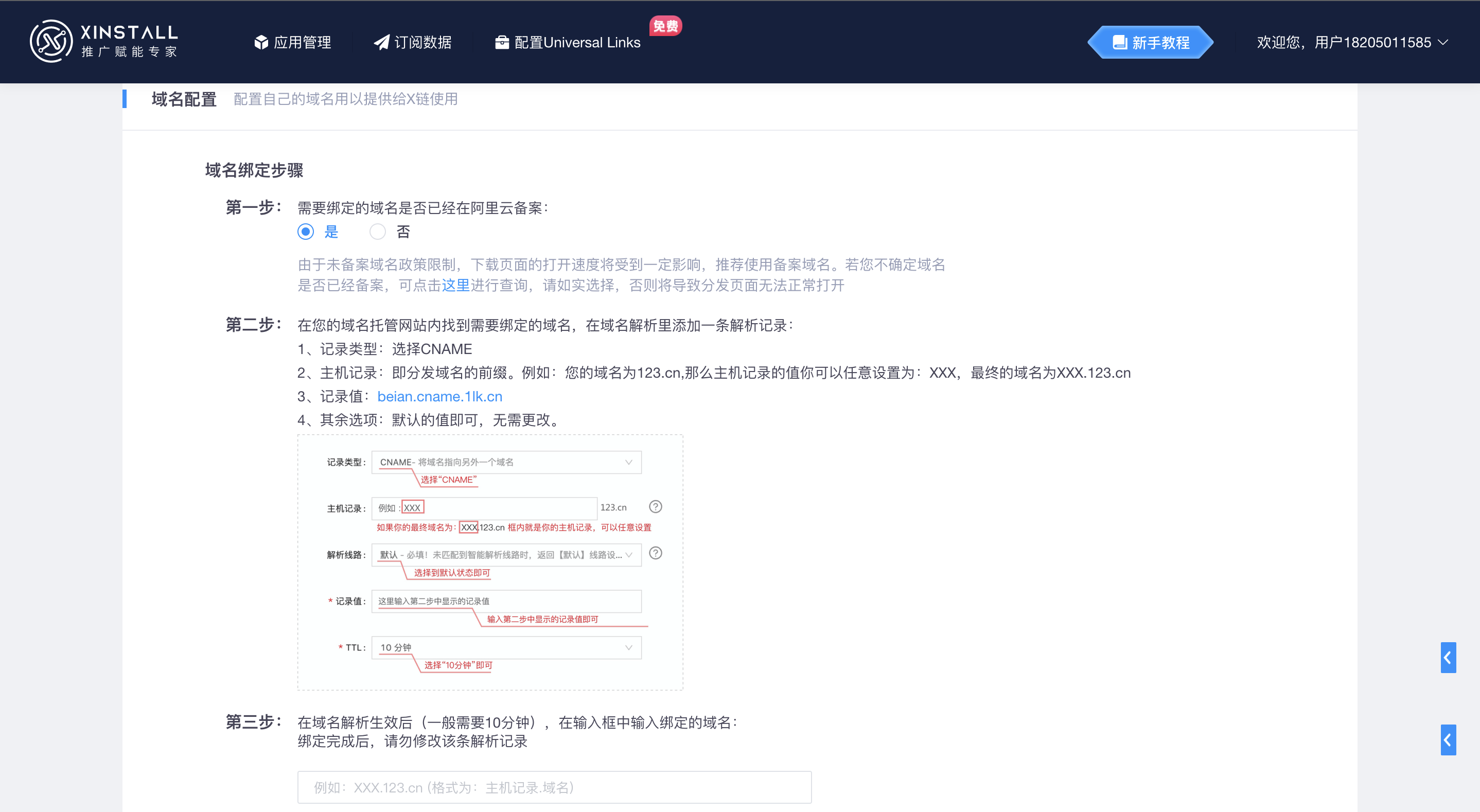 4.将要绑定的域名填入xinstall后台-域名设置对应位置中,点击【绑定】