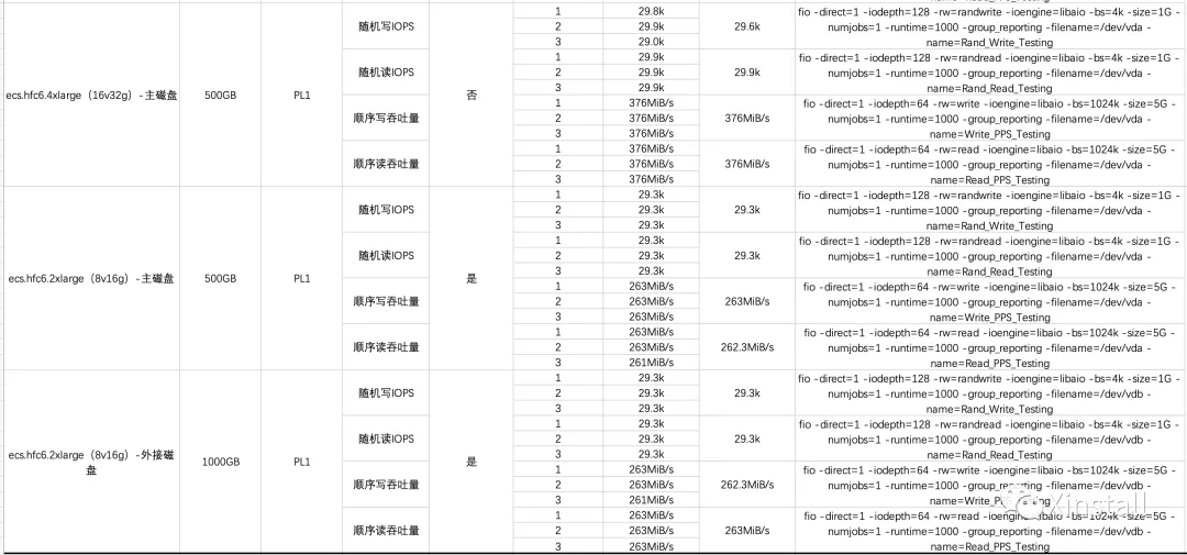 > 测试变量:ECS型号不同、均使用主磁盘、主磁盘均为PL1、主磁盘容量相同、测试命令相同。