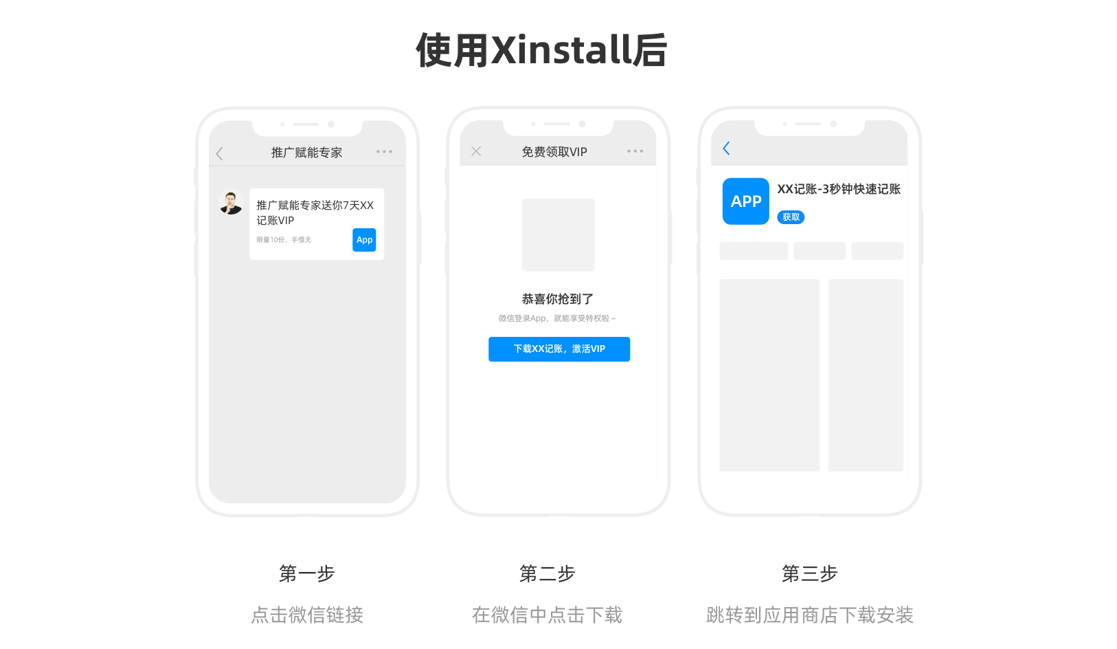 使用Xinstall快速安装功能,微信推广App链接拦截一直是绕不过去的话题,App在进行推广时候需要在微信内进行网页宣传和裂变传播,微信对于第三方推广链接的审核越来越严格了,几乎屏蔽了所有的下载链接。Xinstall拥有App快速安装功能和App分享统计功能。使用Xinstall的可以解决以上问题。